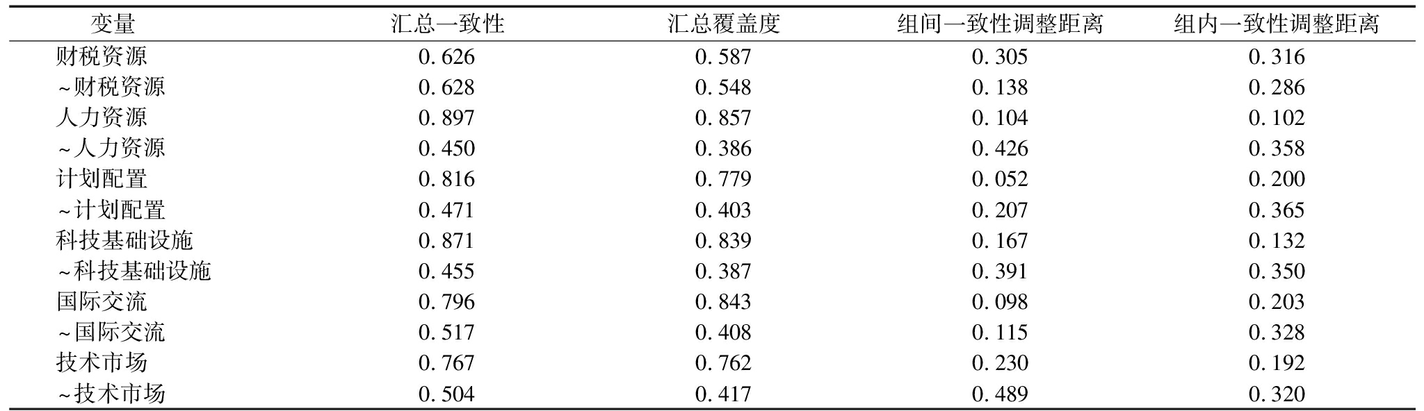 变量 汇总一致性汇总覆盖度组间一致性调整距离组内一致性调整距离财税资源0.6260.5870.305 0.316 ~财税资源0.6280.5480.138 0.286 人力资源0.8970.8570.1040.102 ~人力资源0.4500.3860.4260.358 计划配置0.8160.7790.052 0.200 ~计划配置0.4710.4030.207 0.365 科技基础设施0.8710.8390.167 0.132 ~科技基础设施0.4550.3870.391 0.350 国际交流0.7960.8430.098 0.203 ~国际交流0.5170.4080.115 0.328 技术市场0.7670.7620.230 0.192 ~技术市场0.5040.4170.489 0.320