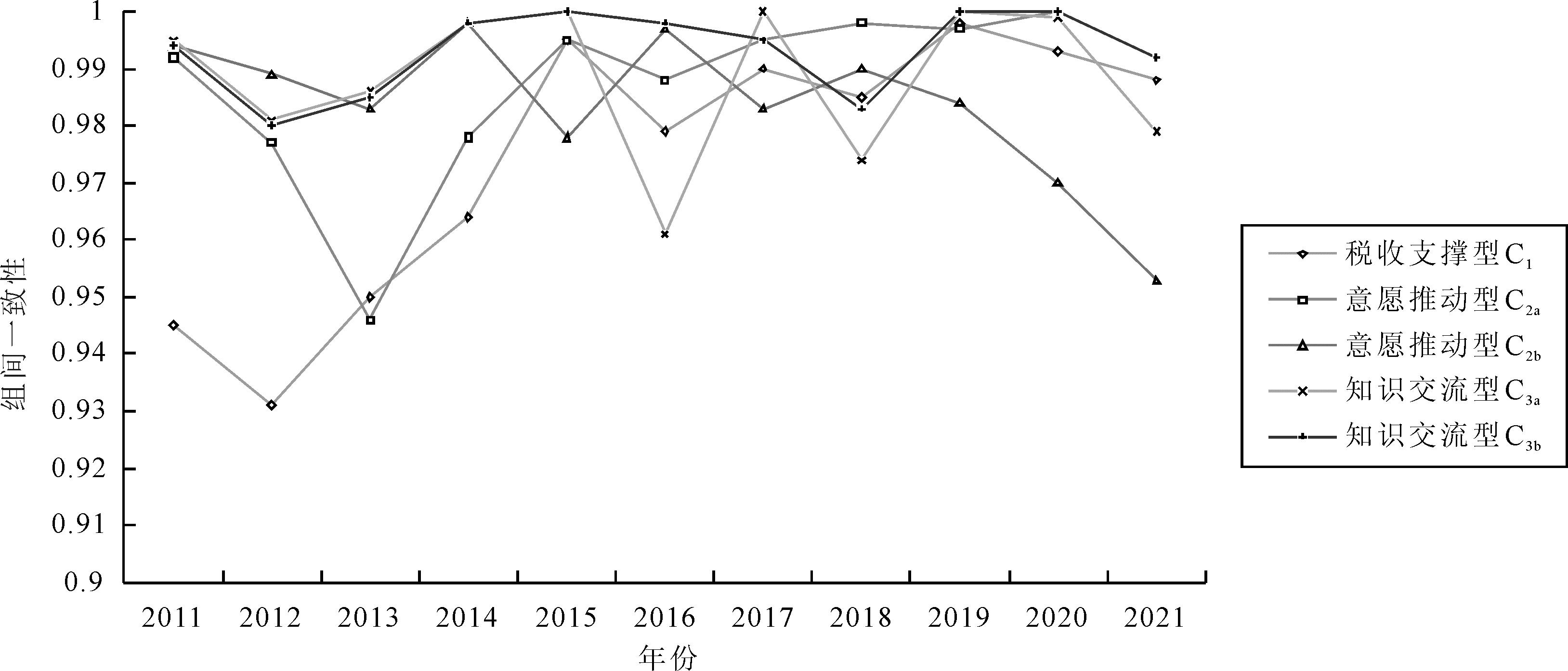 传统QCA方法无法捕捉组态路径的时间效应,而动态QCA方法能够弥补这一缺陷,计算出各组态在不同年份的一致性情况。根据表5,各组态的组间一致性调整距离均小于0.2,表明5种组态不存在时间效应。进一步比较不同组态路径的一致性变化情况,如图2所示。从中可见,各组态历年组间一致性水平均在0.9以上浮动,始终保持高度一致性,可见组态路径比较稳定。其中,财税支撑型组态C1的组间一致性水平呈现缓慢上升趋势,表明随着近年来政府部门愈发重视基础研究,该构型下更需要强大的财税收入保障政府对基础研究活动的支持。意愿推动型组态C2b近年来呈下降趋势,可见财税资源不足会在一定程度上影响地方政府的发展意愿,但未对组态路径产生实质性影响。