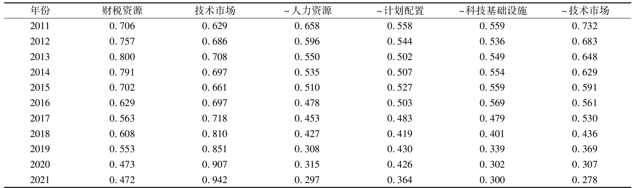 年份财税资源技术市场~人力资源~计划配置~科技基础设施~技术市场20110.7060.6290.658 0.558 0.559 0.732 20120.7570.6860.596 0.544 0.536 0.683 20130.8000.7080.550 0.502 0.549 0.648 20140.7910.6970.535 0.507 0.554 0.629 20150.7020.6610.510 0.527 0.559 0.591 20160.6290.6970.478 0.503 0.569 0.561 20170.5630.7180.453 0.483 0.479 0.530 20180.6080.8100.427 0.419 0.401 0.436 20190.5530.8510.308 0.430 0.339 0.369 20200.4730.9070.315 0.426 0.302 0.307 20210.4720.9420.297 0.364 0.300 0.278