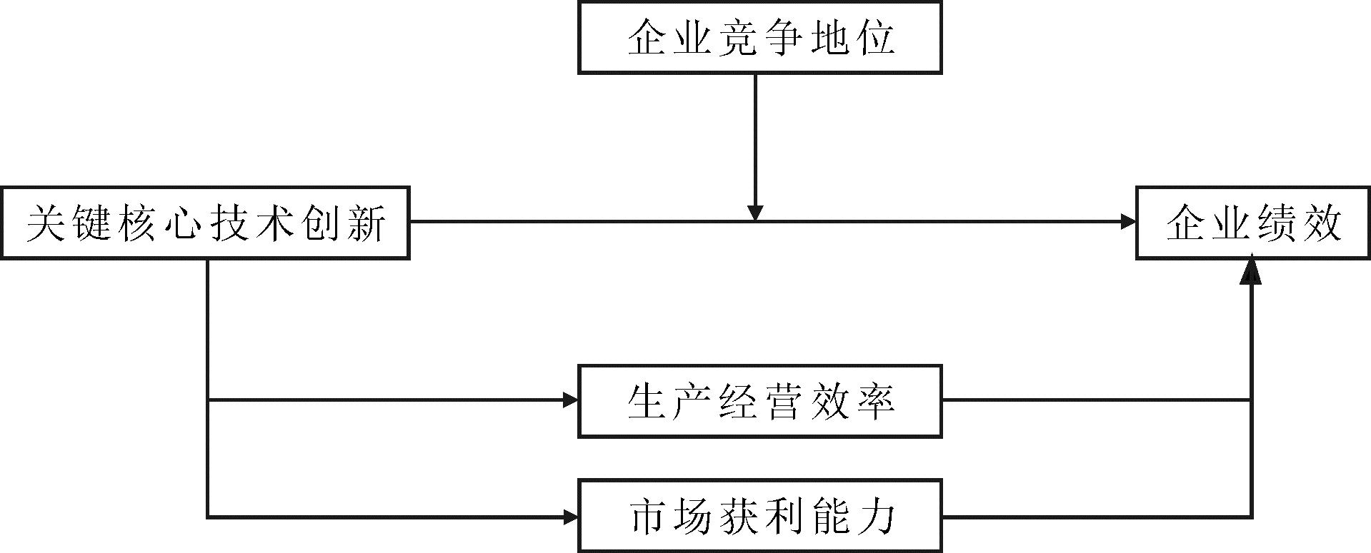 新熊彼特增长理论认为,创新是推动技术进步和经济增长的核心因素[5]。不同于一般性技术创新,关键核心技术具有高壁垒性、垄断性以及难以替代性等特征,技术发展潜力大、经济价值高,能够促进企业新质生产力发展[6],对企业经济发展具有重要影响。作为关键核心技术创新主体,企业开展关键核心技术创新活动需要承担高额的研发投入与巨大的研发风险。由于企业生产运营与经营收益存在不确定性,关键核心技术创新能否提升企业绩效尚未可知,因而有必要深入考察我国技术赶超时期关键核心技术创新对企业绩效的影响。关键核心技术并非随机产生,而是行业内技术领先主体有意规划和构建的技术壁垒[7]。受限于重要创新资源与关键知识元素,竞争地位越高的企业越有优势获取重要创新资源[8],能够通过关键核心技术创新促进自身绩效提升。同时,关键核心技术创新能够促进企业新质生产力发展[6],通过技术进步提高企业生产效率,通过产品迭代或新产品开发增强企业市场获利能力。然而,关键核心技术创新能否通过提升企业生产经营效率与市场获利能力促进企业绩效提升,现有研究尚未给出答案。本文进一步探讨关键核心技术创新对企业绩效的内在影响机制。