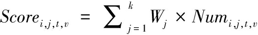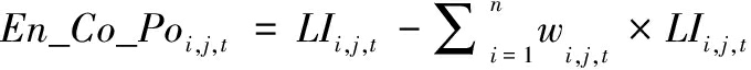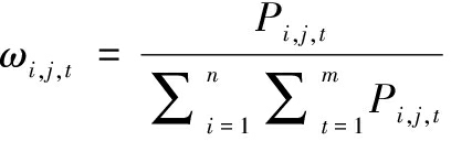 (2)计算企业i指标j第t年的权重,记为ωi,j,t(见式(2))。其中,n为企业个数,m为年数。