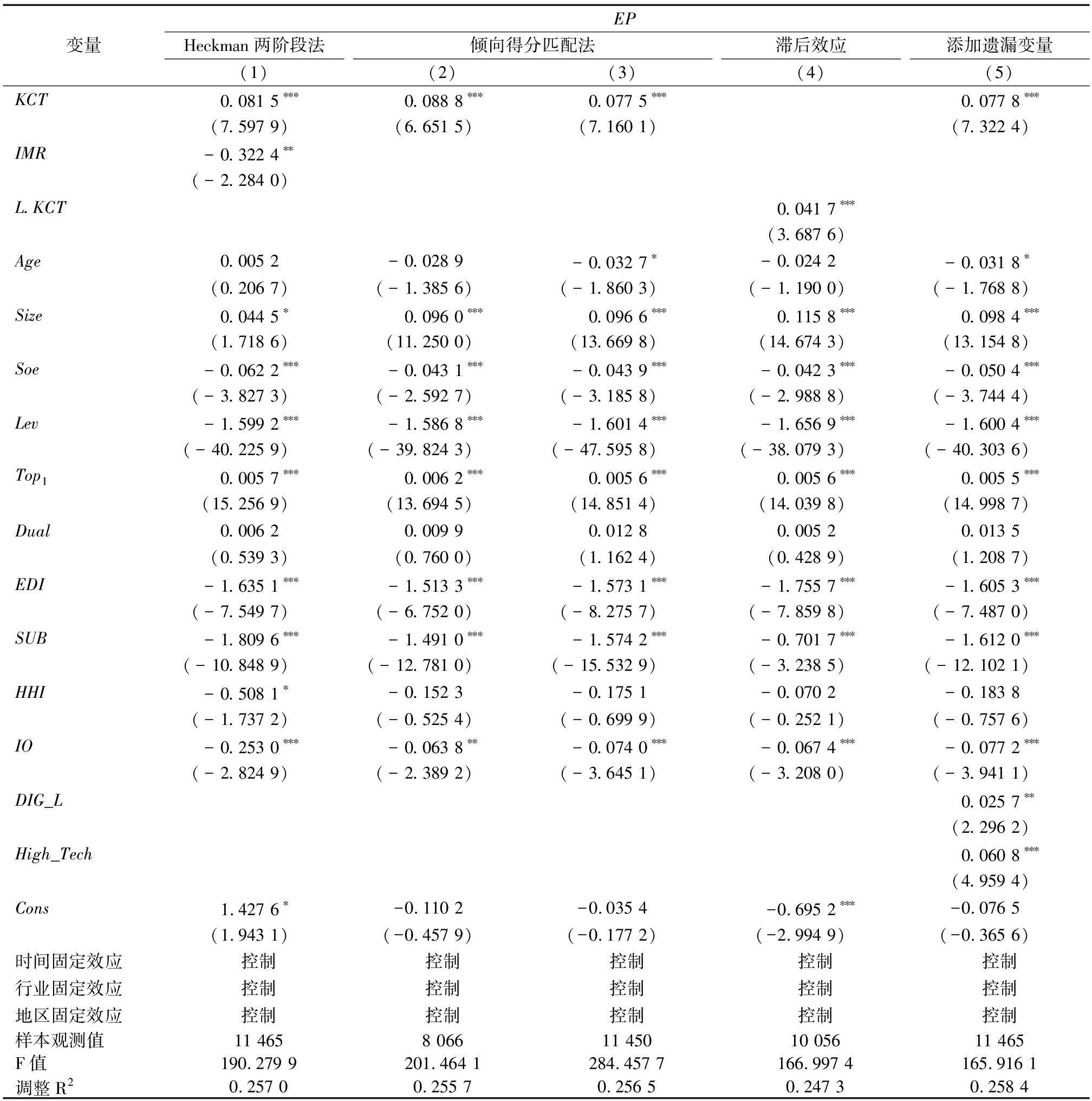 变量EPHeckman两阶段法(1)倾向得分匹配法(2)(3)滞后效应(4)添加遗漏变量(5)KCT0.081 5∗∗∗0.088 8∗∗∗0.077 5∗∗∗0.077 8∗∗∗(7.597 9)(6.651 5)(7.160 1)(7.322 4)IMR-0.322 4∗∗(-2.284 0)L.KCT0.041 7∗∗∗(3.687 6)Age0.005 2-0.028 9-0.032 7∗-0.024 2-0.031 8∗(0.206 7)(-1.385 6)(-1.860 3)(-1.190 0)(-1.768 8)Size0.044 5∗0.096 0∗∗∗0.096 6∗∗∗0.115 8∗∗∗0.098 4∗∗∗(1.718 6)(11.250 0)(13.669 8)(14.674 3)(13.154 8)Soe-0.062 2∗∗∗-0.043 1∗∗∗-0.043 9∗∗∗-0.042 3∗∗∗-0.050 4∗∗∗(-3.827 3)(-2.592 7)(-3.185 8)(-2.988 8)(-3.744 4)Lev-1.599 2∗∗∗-1.586 8∗∗∗-1.601 4∗∗∗-1.656 9∗∗∗-1.600 4∗∗∗(-40.225 9)(-39.824 3)(-47.595 8)(-38.079 3)(-40.303 6)Top10.005 7∗∗∗0.006 2∗∗∗0.005 6∗∗∗0.005 6∗∗∗0.005 5∗∗∗(15.256 9)(13.694 5)(14.851 4)(14.039 8)(14.998 7)Dual0.006 20.009 90.012 80.005 20.013 5(0.539 3)(0.760 0)(1.162 4)(0.428 9)(1.208 7)EDI-1.635 1∗∗∗-1.513 3∗∗∗-1.573 1∗∗∗-1.755 7∗∗∗-1.605 3∗∗∗(-7.549 7)(-6.752 0)(-8.275 7)(-7.859 8)(-7.487 0)SUB-1.809 6∗∗∗-1.491 0∗∗∗-1.574 2∗∗∗-0.701 7∗∗∗-1.612 0∗∗∗(-10.848 9)(-12.781 0)(-15.532 9)(-3.238 5)(-12.102 1)HHI-0.508 1∗-0.152 3-0.175 1-0.070 2-0.183 8(-1.737 2)(-0.525 4)(-0.699 9)(-0.252 1)(-0.757 6)IO-0.253 0∗∗∗-0.063 8∗∗-0.074 0∗∗∗-0.067 4∗∗∗-0.077 2∗∗∗(-2.824 9)(-2.389 2)(-3.645 1)(-3.208 0)(-3.941 1)DIG_L0.025 7∗∗(2.296 2)High_Tech0.060 8∗∗∗(4.959 4)Cons1.427 6∗-0.110 2-0.035 4-0.695 2∗∗∗-0.076 5(1.943 1)(-0.457 9)(-0.177 2)(-2.994 9)(-0.365 6)时间固定效应控制控制控制控制控制行业固定效应控制控制控制控制控制地区固定效应控制控制控制控制控制样本观测值11 4658 06611 45010 05611 465F值190.279 9201.464 1284.457 7166.997 4165.916 1调整R20.257 00.255 70.256 50.247 30.258 4