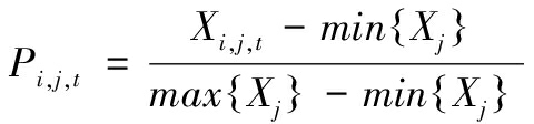 其中,Pi,j,t为标准化处理后企业i指标j第t年的值,Xi,j,t为标准化处理前企业i指标j第t年的值,max{Xj}为样本中指标j的最大值,min{Xj}为样本中指标j的最小值。
