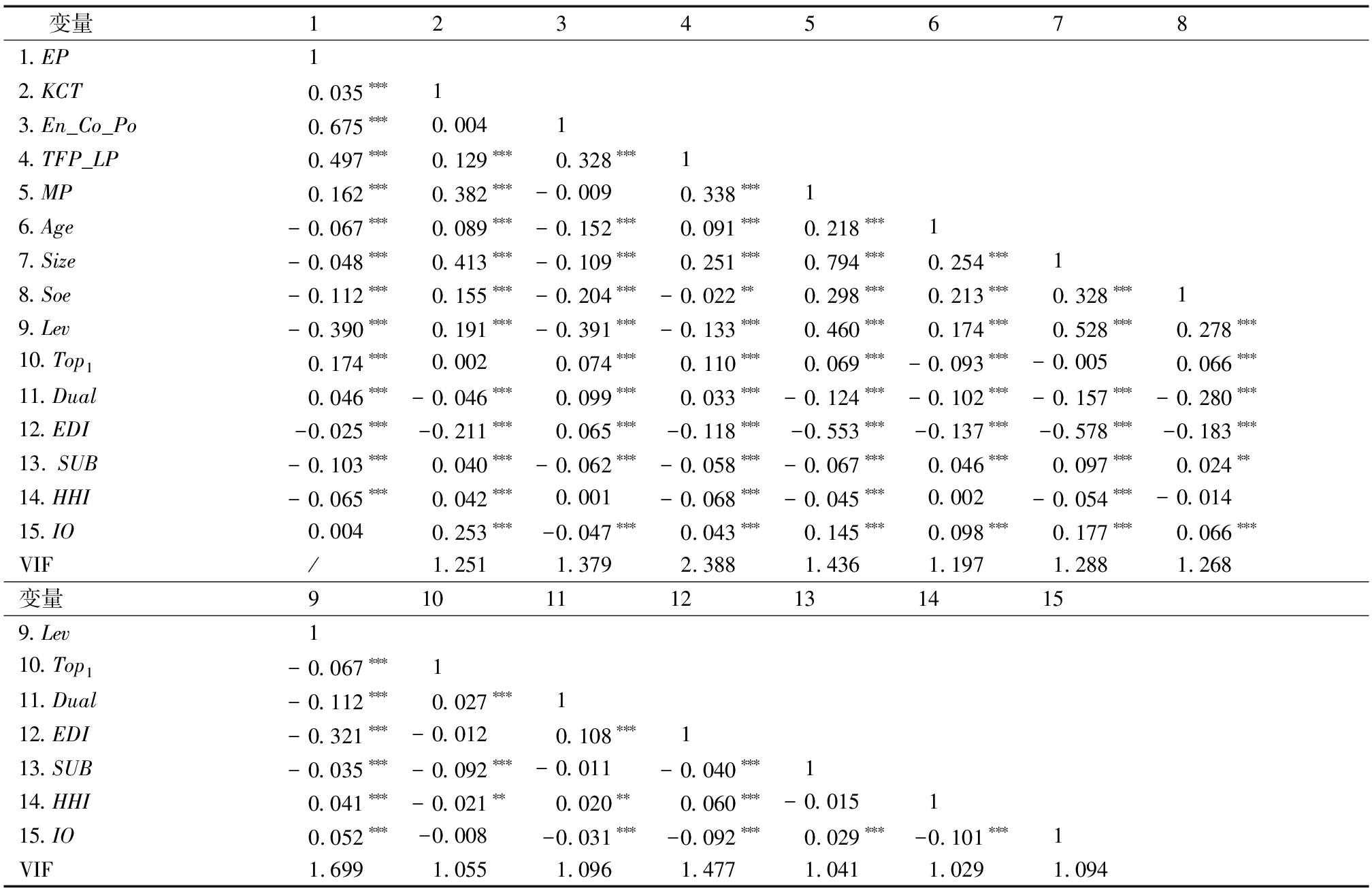 变量123456781.EP12.KCT0.035∗∗∗13.En_Co_Po0.675∗∗∗0.00414.TFP_LP0.497∗∗∗0.129∗∗∗0.328∗∗∗15.MP0.162∗∗∗0.382∗∗∗-0.0090.338∗∗∗16.Age-0.067∗∗∗0.089∗∗∗-0.152∗∗∗0.091∗∗∗0.218∗∗∗17.Size-0.048∗∗∗0.413∗∗∗-0.109∗∗∗0.251∗∗∗0.794∗∗∗0.254∗∗∗18.Soe-0.112∗∗∗0.155∗∗∗-0.204∗∗∗-0.022∗∗0.298∗∗∗0.213∗∗∗0.328∗∗∗19.Lev-0.390∗∗∗0.191∗∗∗-0.391∗∗∗-0.133∗∗∗0.460∗∗∗0.174∗∗∗0.528∗∗∗0.278∗∗∗10.Top10.174∗∗∗0.0020.074∗∗∗0.110∗∗∗0.069∗∗∗-0.093∗∗∗-0.0050.066∗∗∗11.Dual0.046∗∗∗-0.046∗∗∗0.099∗∗∗0.033∗∗∗-0.124∗∗∗-0.102∗∗∗-0.157∗∗∗-0.280∗∗∗12.EDI-0.025∗∗∗-0.211∗∗∗0.065∗∗∗-0.118∗∗∗-0.553∗∗∗-0.137∗∗∗-0.578∗∗∗-0.183∗∗∗13.SUB-0.103∗∗∗0.040∗∗∗-0.062∗∗∗-0.058∗∗∗-0.067∗∗∗0.046∗∗∗0.097∗∗∗0.024∗∗14.HHI-0.065∗∗∗0.042∗∗∗0.001-0.068∗∗∗-0.045∗∗∗0.002-0.054∗∗∗-0.01415.IO0.0040.253∗∗∗-0.047∗∗∗0.043∗∗∗0.145∗∗∗0.098∗∗∗0.177∗∗∗0.066∗∗∗VIF/1.2511.3792.3881.4361.1971.2881.268变量91011121314159.Lev110.Top1-0.067∗∗∗111.Dual-0.112∗∗∗0.027∗∗∗112.EDI-0.321∗∗∗-0.0120.108∗∗∗113.SUB-0.035∗∗∗-0.092∗∗∗-0.011-0.040∗∗∗114.HHI0.041∗∗∗-0.021∗∗0.020∗∗0.060∗∗∗-0.015115.IO0.052∗∗∗-0.008-0.031∗∗∗-0.092∗∗∗0.029∗∗∗-0.101∗∗∗1VIF1.6991.0551.0961.4771.0411.0291.094