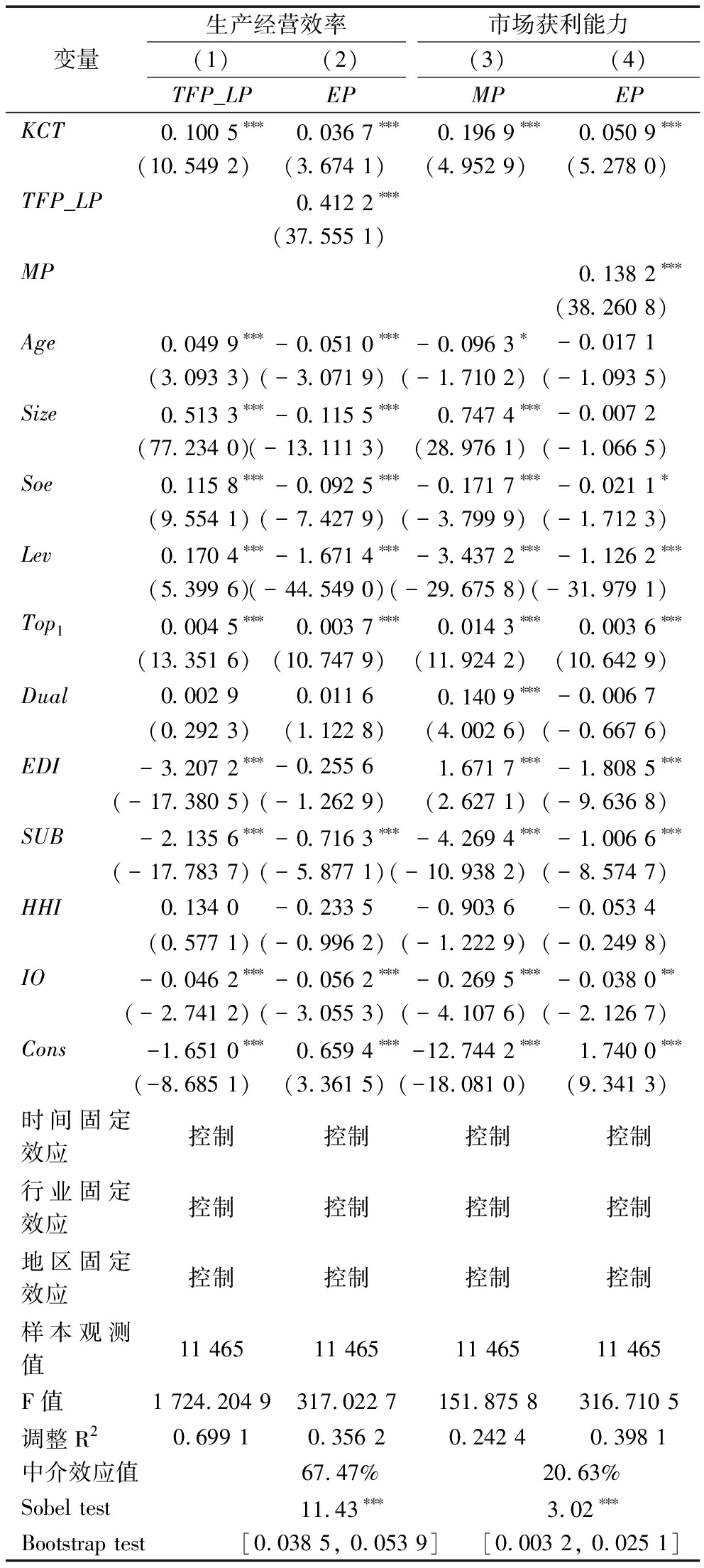 变量生产经营效率(1)(2)TFP_LPEP市场获利能力(3)(4)MPEPKCT0.100 5∗∗∗0.036 7∗∗∗0.196 9∗∗∗0.050 9∗∗∗(10.549 2)(3.674 1)(4.952 9)(5.278 0)TFP_LP0.412 2∗∗∗(37.555 1)MP0.138 2∗∗∗(38.260 8)Age0.049 9∗∗∗-0.051 0∗∗∗-0.096 3∗-0.017 1(3.093 3)(-3.071 9)(-1.710 2)(-1.093 5)Size0.513 3∗∗∗-0.115 5∗∗∗0.747 4∗∗∗-0.007 2(77.234 0)(-13.111 3)(28.976 1)(-1.066 5)Soe0.115 8∗∗∗-0.092 5∗∗∗-0.171 7∗∗∗-0.021 1∗(9.554 1)(-7.427 9)(-3.799 9)(-1.712 3)Lev0.170 4∗∗∗-1.671 4∗∗∗-3.437 2∗∗∗-1.126 2∗∗∗(5.399 6)(-44.549 0)(-29.675 8)(-31.979 1)Top10.004 5∗∗∗0.003 7∗∗∗0.014 3∗∗∗0.003 6∗∗∗(13.351 6)(10.747 9)(11.924 2)(10.642 9)Dual0.002 90.011 60.140 9∗∗∗-0.006 7(0.292 3)(1.122 8)(4.002 6)(-0.667 6)EDI-3.207 2∗∗∗-0.255 61.671 7∗∗∗-1.808 5∗∗∗(-17.380 5)(-1.262 9)(2.627 1)(-9.636 8)SUB-2.135 6∗∗∗-0.716 3∗∗∗-4.269 4∗∗∗-1.006 6∗∗∗(-17.783 7)(-5.877 1)(-10.938 2)(-8.574 7)HHI0.134 0-0.233 5-0.903 6-0.053 4(0.577 1)(-0.996 2)(-1.222 9)(-0.249 8)IO-0.046 2∗∗∗-0.056 2∗∗∗-0.269 5∗∗∗-0.038 0∗∗(-2.741 2)(-3.055 3)(-4.107 6)(-2.126 7)Cons-1.651 0∗∗∗0.659 4∗∗∗-12.744 2∗∗∗1.740 0∗∗∗(-8.685 1)(3.361 5)(-18.081 0)(9.341 3)时间固定效应控制控制控制控制行业固定效应控制控制控制控制地区固定效应控制控制控制控制样本观测值11 46511 46511 46511 465F值1 724.204 9317.022 7151.875 8316.710 5调整R20.699 10.356 20.242 40.398 1中介效应值67.47%20.63%Sobel test11.43∗∗∗3.02∗∗∗Bootstrap test[0.038 5, 0.053 9][0.003 2, 0.025 1]