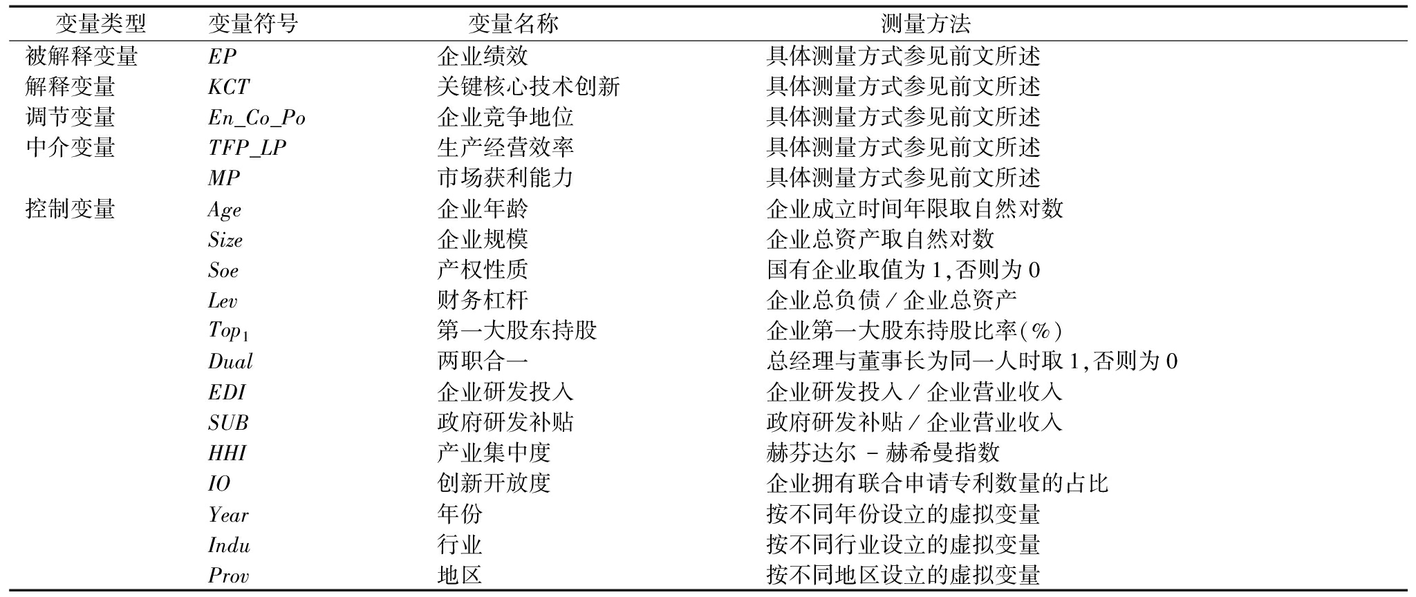 变量类型变量符号变量名称 测量方法被解释变量EP企业绩效具体测量方式参见前文所述解释变量KCT关键核心技术创新具体测量方式参见前文所述调节变量En_Co_Po企业竞争地位具体测量方式参见前文所述中介变量TFP_LP生产经营效率具体测量方式参见前文所述MP市场获利能力具体测量方式参见前文所述控制变量Age企业年龄企业成立时间年限取自然对数Size企业规模企业总资产取自然对数Soe产权性质国有企业取值为1,否则为0Lev财务杠杆企业总负债/企业总资产Top1第一大股东持股企业第一大股东持股比率(%)Dual两职合一总经理与董事长为同一人时取1,否则为0EDI企业研发投入企业研发投入/企业营业收入SUB政府研发补贴政府研发补贴/企业营业收入HHI产业集中度赫芬达尔-赫希曼指数IO创新开放度企业拥有联合申请专利数量的占比Year年份按不同年份设立的虚拟变量Indu行业按不同行业设立的虚拟变量Prov地区按不同地区设立的虚拟变量