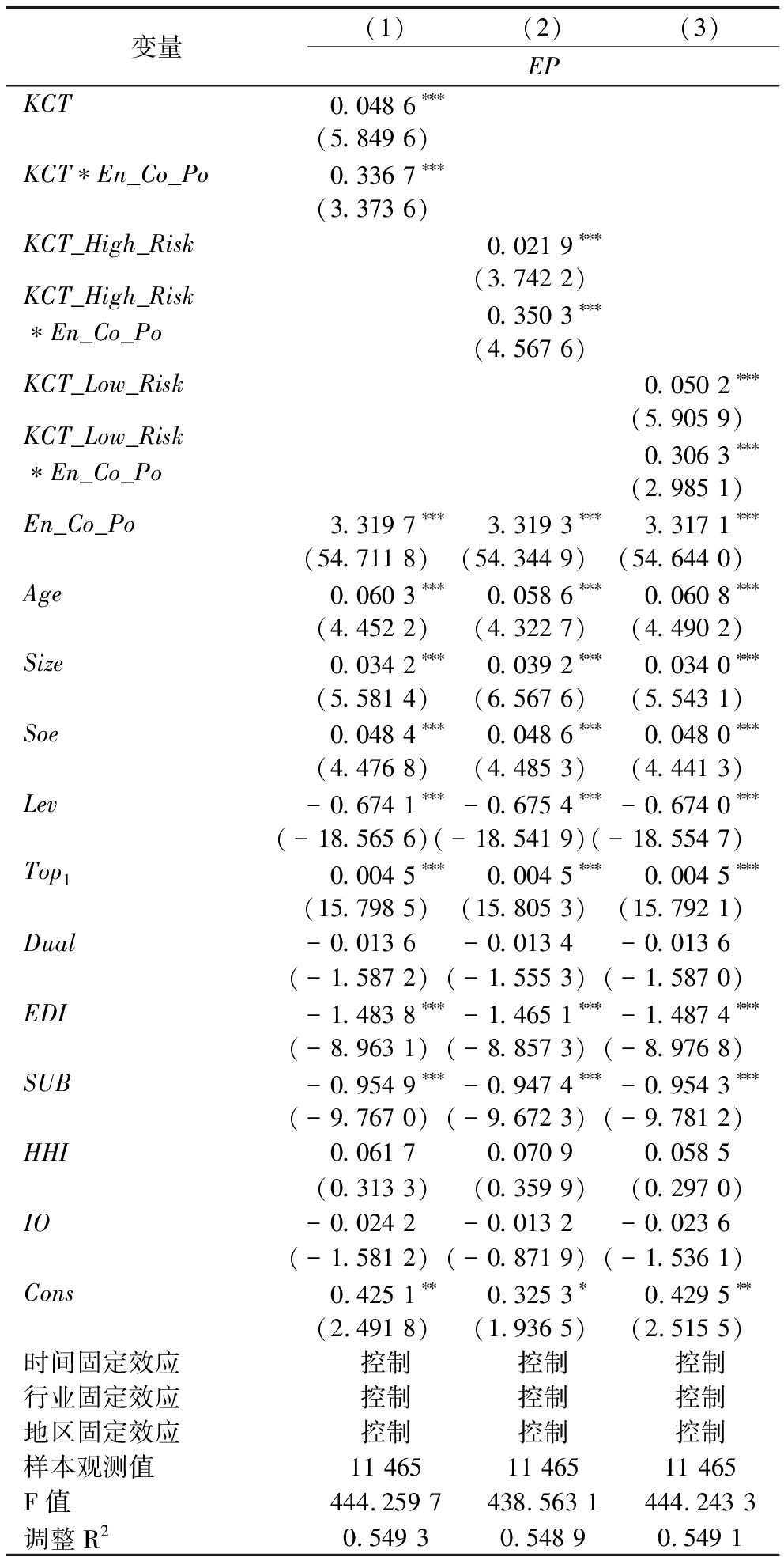 变量(1)(2)(3)EPKCT0.048 6∗∗∗(5.849 6)KCT∗En_Co_Po0.336 7∗∗∗(3.373 6)KCT_High_Risk0.021 9∗∗∗(3.742 2)KCT_High_Risk∗En_Co_Po0.350 3∗∗∗(4.567 6)KCT_Low_Risk0.050 2∗∗∗(5.905 9)KCT_Low_Risk∗En_Co_Po0.306 3∗∗∗(2.985 1)En_Co_Po3.319 7∗∗∗3.319 3∗∗∗3.317 1∗∗∗ (54.711 8)(54.344 9)(54.644 0) Age0.060 3∗∗∗0.058 6∗∗∗0.060 8∗∗∗ (4.452 2)(4.322 7)(4.490 2) Size0.034 2∗∗∗0.039 2∗∗∗0.034 0∗∗∗ (5.581 4)(6.567 6)(5.543 1) Soe0.048 4∗∗∗0.048 6∗∗∗0.048 0∗∗∗ (4.476 8)(4.485 3)(4.441 3) Lev-0.674 1∗∗∗-0.675 4∗∗∗-0.674 0∗∗∗ (-18.565 6)(-18.541 9)(-18.554 7) Top10.004 5∗∗∗0.004 5∗∗∗0.004 5∗∗∗ (15.798 5)(15.805 3)(15.792 1) Dual-0.013 6-0.013 4-0.013 6 (-1.587 2)(-1.555 3)(-1.587 0) EDI-1.483 8∗∗∗-1.465 1∗∗∗-1.487 4∗∗∗ (-8.963 1)(-8.857 3)(-8.976 8) SUB-0.954 9∗∗∗-0.947 4∗∗∗-0.954 3∗∗∗ (-9.767 0)(-9.672 3)(-9.781 2) HHI0.061 70.070 90.058 5 (0.313 3)(0.359 9)(0.297 0) IO-0.024 2-0.013 2-0.023 6 (-1.581 2)(-0.871 9)(-1.536 1) Cons0.425 1∗∗0.325 3∗0.429 5∗∗ (2.491 8)(1.936 5)(2.515 5)时间固定效应控制控制控制行业固定效应控制控制控制地区固定效应控制控制控制样本观测值11 46511 46511 465F值444.259 7438.563 1444.243 3调整R20.549 30.548 90.549 1