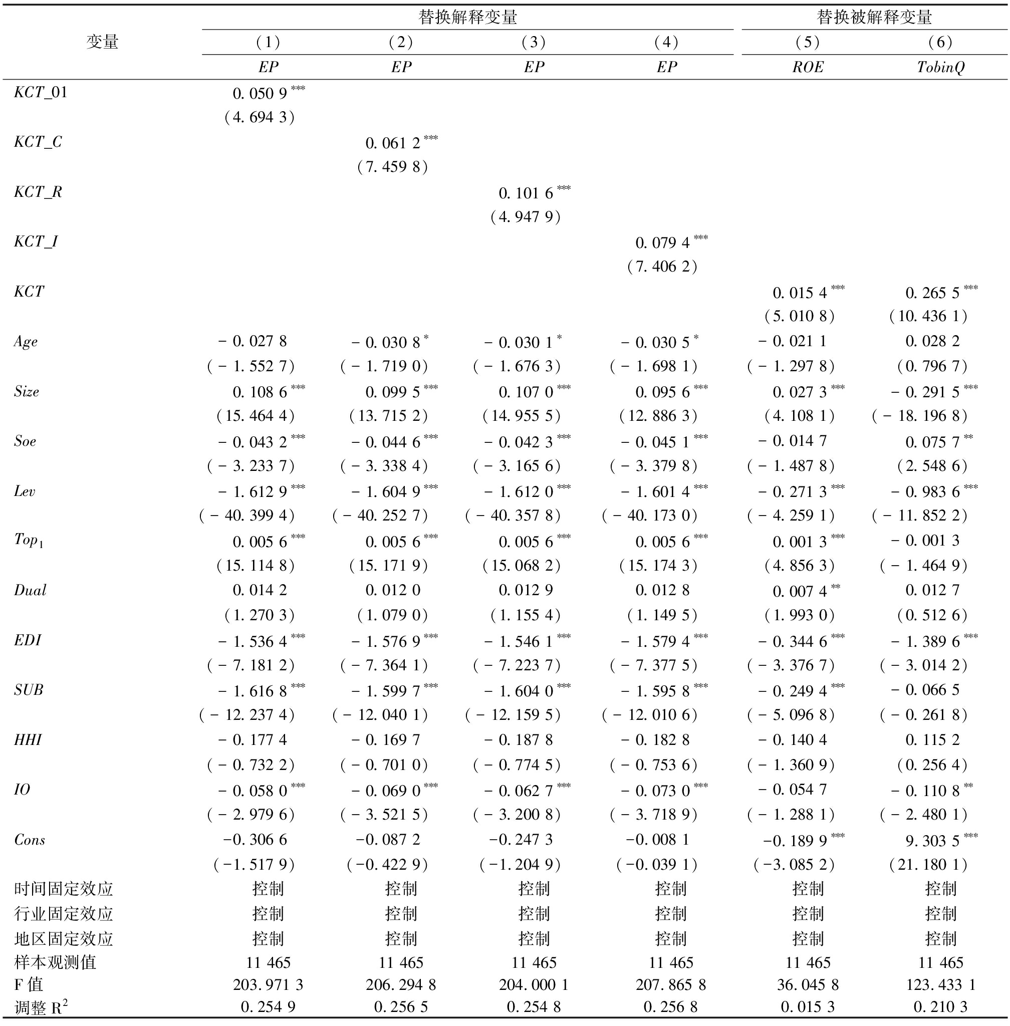 变量替换解释变量(1)(2)(3)(4)EPEPEPEP替换被解释变量(5)(6)ROETobinQKCT_010.050 9∗∗∗(4.694 3)KCT_C0.061 2∗∗∗(7.459 8)KCT_R0.101 6∗∗∗(4.947 9)KCT_I0.079 4∗∗∗(7.406 2)KCT0.015 4∗∗∗0.265 5∗∗∗(5.010 8)(10.436 1)Age-0.027 8-0.030 8∗-0.030 1∗-0.030 5∗-0.021 10.028 2(-1.552 7)(-1.719 0)(-1.676 3)(-1.698 1)(-1.297 8)(0.796 7)Size0.108 6∗∗∗0.099 5∗∗∗0.107 0∗∗∗0.095 6∗∗∗0.027 3∗∗∗-0.291 5∗∗∗(15.464 4)(13.715 2)(14.955 5)(12.886 3)(4.108 1)(-18.196 8)Soe-0.043 2∗∗∗-0.044 6∗∗∗-0.042 3∗∗∗-0.045 1∗∗∗-0.014 70.075 7∗∗(-3.233 7)(-3.338 4)(-3.165 6)(-3.379 8)(-1.487 8)(2.548 6)Lev-1.612 9∗∗∗-1.604 9∗∗∗-1.612 0∗∗∗-1.601 4∗∗∗-0.271 3∗∗∗-0.983 6∗∗∗(-40.399 4)(-40.252 7)(-40.357 8)(-40.173 0)(-4.259 1)(-11.852 2)Top10.005 6∗∗∗0.005 6∗∗∗0.005 6∗∗∗0.005 6∗∗∗0.001 3∗∗∗-0.001 3(15.114 8)(15.171 9)(15.068 2)(15.174 3)(4.856 3)(-1.464 9)Dual0.014 20.012 00.012 90.012 80.007 4∗∗0.012 7(1.270 3)(1.079 0)(1.155 4)(1.149 5)(1.993 0)(0.512 6)EDI-1.536 4∗∗∗-1.576 9∗∗∗-1.546 1∗∗∗-1.579 4∗∗∗-0.344 6∗∗∗-1.389 6∗∗∗(-7.181 2)(-7.364 1)(-7.223 7)(-7.377 5)(-3.376 7)(-3.014 2)SUB-1.616 8∗∗∗-1.599 7∗∗∗-1.604 0∗∗∗-1.595 8∗∗∗-0.249 4∗∗∗-0.066 5(-12.237 4)(-12.040 1)(-12.159 5)(-12.010 6)(-5.096 8)(-0.261 8)HHI-0.177 4-0.169 7-0.187 8-0.182 8-0.140 40.115 2(-0.732 2)(-0.701 0)(-0.774 5)(-0.753 6)(-1.360 9)(0.256 4)IO-0.058 0∗∗∗-0.069 0∗∗∗-0.062 7∗∗∗-0.073 0∗∗∗-0.054 7-0.110 8∗∗(-2.979 6)(-3.521 5)(-3.200 8)(-3.718 9)(-1.288 1)(-2.480 1)Cons-0.306 6-0.087 2-0.247 3-0.008 1-0.189 9∗∗∗9.303 5∗∗∗(-1.517 9)(-0.422 9)(-1.204 9)(-0.039 1)(-3.085 2)(21.180 1)时间固定效应控制控制控制控制控制控制行业固定效应控制控制控制控制控制控制地区固定效应控制控制控制控制控制控制样本观测值11 46511 46511 46511 46511 46511 465F值203.971 3206.294 8204.000 1207.865 836.045 8123.433 1调整R20.254 90.256 50.254 80.256 80.015 30.210 3