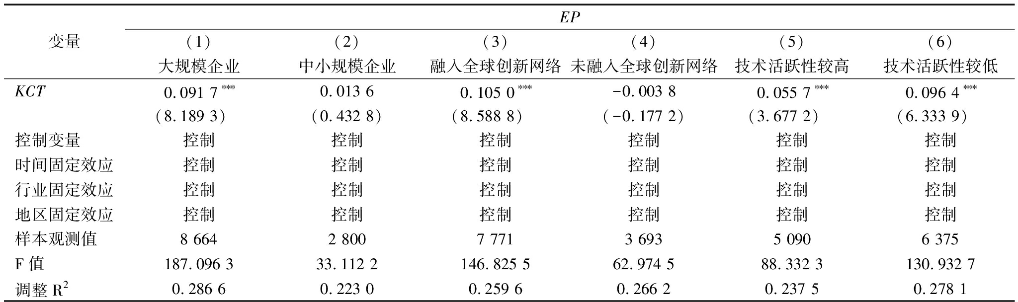 变量EP(1)(2)(3)(4)(5)(6)大规模企业中小规模企业融入全球创新网络未融入全球创新网络技术活跃性较高技术活跃性较低KCT0.091 7∗∗∗0.013 60.105 0∗∗∗-0.003 80.055 7∗∗∗0.096 4∗∗∗(8.189 3)(0.432 8)(8.588 8)(-0.177 2)(3.677 2)(6.333 9)控制变量控制控制控制控制控制控制时间固定效应控制控制控制控制控制控制行业固定效应控制控制控制控制控制控制地区固定效应控制控制控制控制控制控制样本观测值8 6642 8007 7713 6935 0906 375F值187.096 333.112 2146.825 562.974 588.332 3130.932 7调整R20.286 60.223 00.259 60.266 20.237 50.278 1