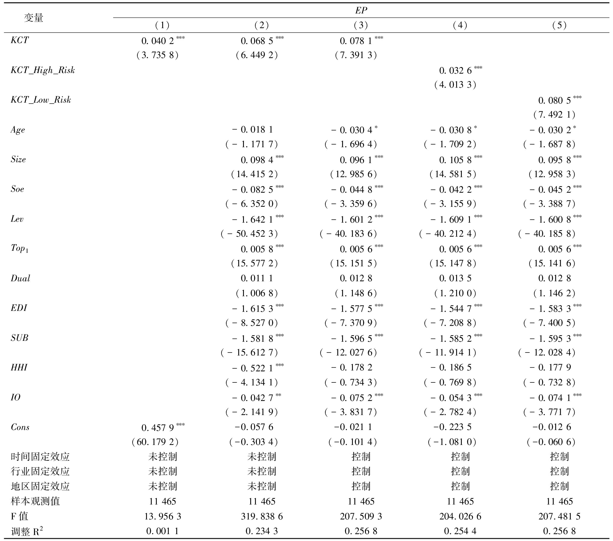 变量EP(1)(2)(3)(4)(5)KCT0.040 2∗∗∗0.068 5∗∗∗0.078 1∗∗∗(3.735 8)(6.449 2)(7.391 3)KCT_High_Risk0.032 6∗∗∗(4.013 3)KCT_Low_Risk0.080 5∗∗∗(7.492 1)Age-0.018 1-0.030 4∗-0.030 8∗-0.030 2∗(-1.171 7)(-1.696 4)(-1.709 2)(-1.687 8)Size0.098 4∗∗∗0.096 1∗∗∗0.105 8∗∗∗0.095 8∗∗∗(14.415 2)(12.985 6)(14.581 5)(12.958 3)Soe-0.082 5∗∗∗-0.044 8∗∗∗-0.042 2∗∗∗-0.045 2∗∗∗(-6.352 0)(-3.359 6)(-3.155 9)(-3.388 7)Lev-1.642 1∗∗∗-1.601 2∗∗∗-1.609 1∗∗∗-1.600 8∗∗∗(-50.452 3)(-40.183 6)(-40.212 4)(-40.185 8)Top10.005 8∗∗∗0.005 6∗∗∗0.005 6∗∗∗0.005 6∗∗∗(15.577 2)(15.151 5)(15.147 8)(15.141 6)Dual0.011 10.012 80.013 50.012 8(1.006 8)(1.148 6)(1.210 0)(1.146 2)EDI-1.615 3∗∗∗-1.577 5∗∗∗-1.544 7∗∗∗-1.583 3∗∗∗(-8.527 0)(-7.370 9)(-7.208 8)(-7.400 5)SUB-1.581 8∗∗∗-1.596 5∗∗∗-1.585 2∗∗∗-1.595 3∗∗∗(-15.612 7)(-12.027 6)(-11.914 1)(-12.028 4)HHI-0.522 1∗∗∗-0.178 2-0.186 5-0.177 9(-4.134 1)(-0.734 3)(-0.769 8)(-0.732 8)IO-0.042 7∗∗-0.075 2∗∗∗-0.054 3∗∗∗-0.074 1∗∗∗(-2.141 9)(-3.831 7)(-2.782 4)(-3.771 7)Cons0.457 9∗∗∗-0.057 6-0.021 1-0.223 5-0.012 6(60.179 2)(-0.303 4)(-0.101 4)(-1.081 0)(-0.060 6)时间固定效应未控制未控制控制控制控制行业固定效应未控制未控制控制控制控制地区固定效应未控制未控制控制控制控制样本观测值11 46511 46511 46511 46511 465F值13.956 3319.838 6207.509 3204.026 6207.481 5调整R20.001 10.234 30.256 80.254 40.256 8