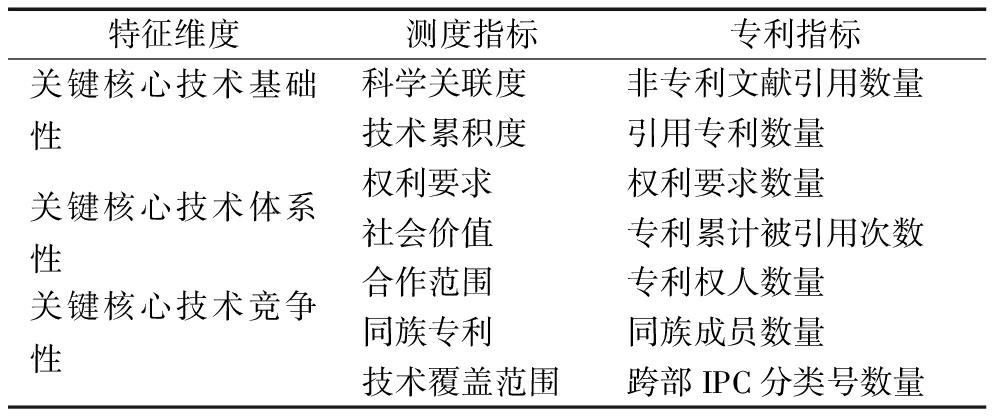 特征维度测度指标专利指标关键核心技术基础性科学关联度非专利文献引用数量技术累积度引用专利数量权利要求权利要求数量关键核心技术体系性社会价值专利累计被引用次数合作范围专利权人数量关键核心技术竞争性同族专利同族成员数量技术覆盖范围跨部IPC分类号数量