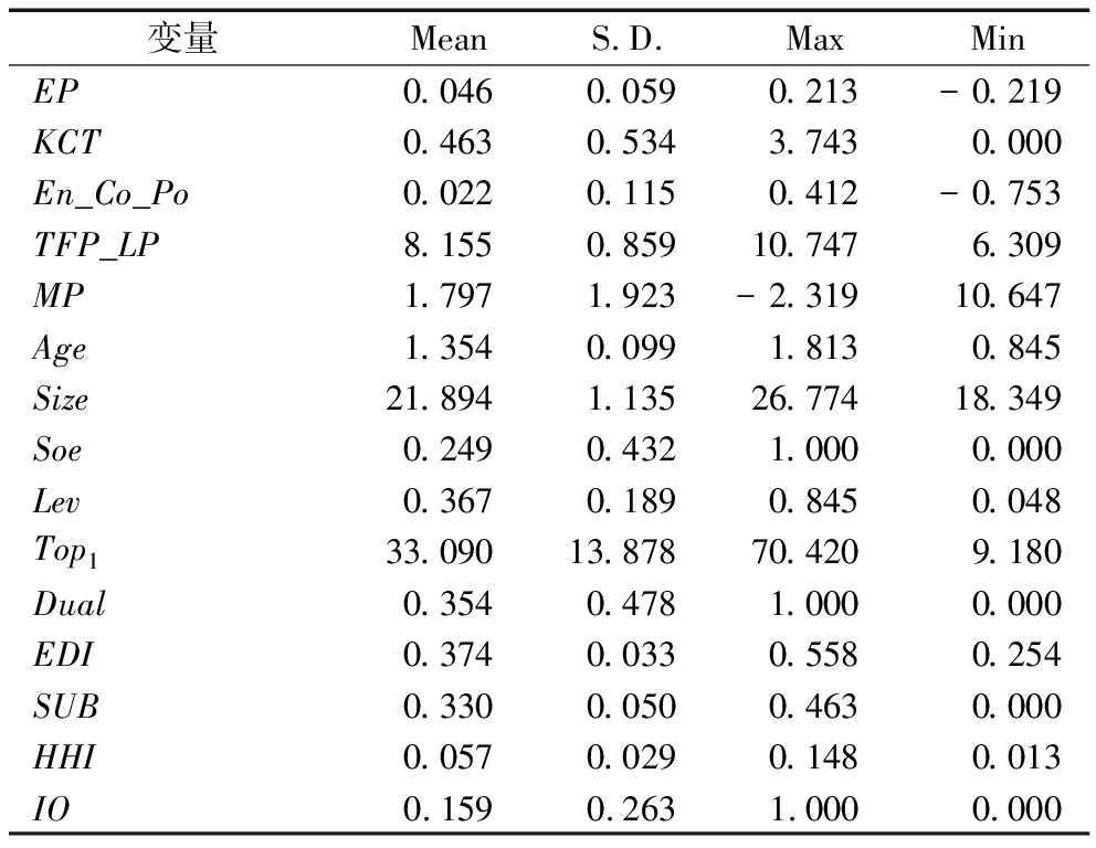 变量MeanS.D.MaxMinEP0.0460.0590.213-0.219KCT0.4630.5343.7430.000En_Co_Po0.0220.1150.412-0.753TFP_LP8.1550.85910.7476.309MP1.7971.923-2.31910.647Age1.3540.0991.8130.845Size21.8941.13526.77418.349Soe0.2490.4321.0000.000Lev0.3670.1890.8450.048Top133.09013.87870.4209.180Dual0.3540.4781.0000.000EDI0.3740.0330.5580.254SUB0.3300.0500.4630.000HHI0.0570.0290.1480.013IO0.1590.2631.0000.000