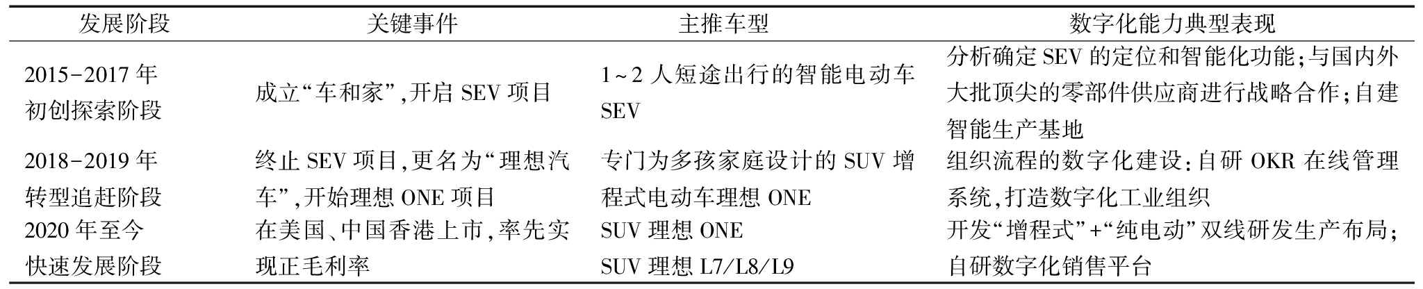 公司创始人李想曾创办全球访问量最大的汽车网站——汽车之家,深谙用户需求并具备互联网思维。在他带领下,理想被誉为最具“互联网基因”的造车新势力之一,注重多方协同与数据驱动。从研发到制造、营销再到服务,理想借助大数据、云计算、物联网等多种数字技术不断提升数字化能力并建立竞争优势,成为中国造车新势力中的领军企业,现已建成常州数字化智能制造工厂、北京顺义纯电动乘用车数字化、柔性化智能制造工厂,拥有497家零售中心,覆盖148个城市。结合理想创业历程中的关键事件及数字化建设过程,将其发展历程划分为3个阶段,如表1所示。