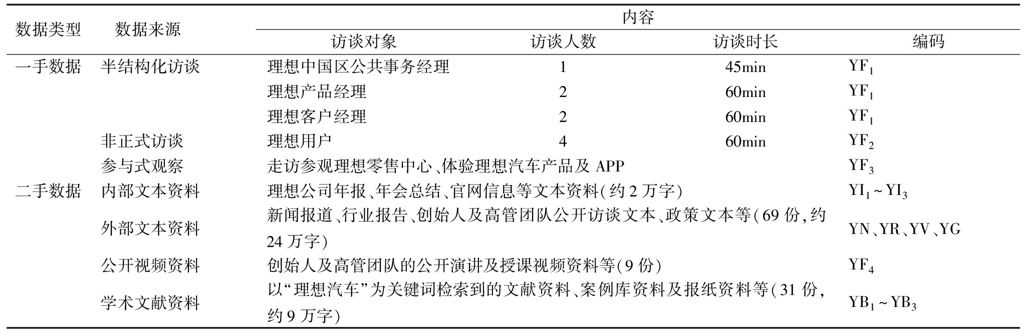 本文通过多渠道收集数据,并对数据进行交叉验证。第一,半结构化访谈和参与式观察。团队于2021年12月和2022年3月,对理想中国区公共事务经理、产品经理和客户经理进行访谈,走访参观理想零售中心、体验理想汽车产品,获得一手数据。第二,非正式访谈。2023年4月和5月,团队先后与4位理想用户进行非正式访谈,获得一手资料文本约5万字。第三,二手资料收集。团队通过公司内部文本资料、公司网站和案例库等渠道获得二手数据。案例资料来源如表2所示。