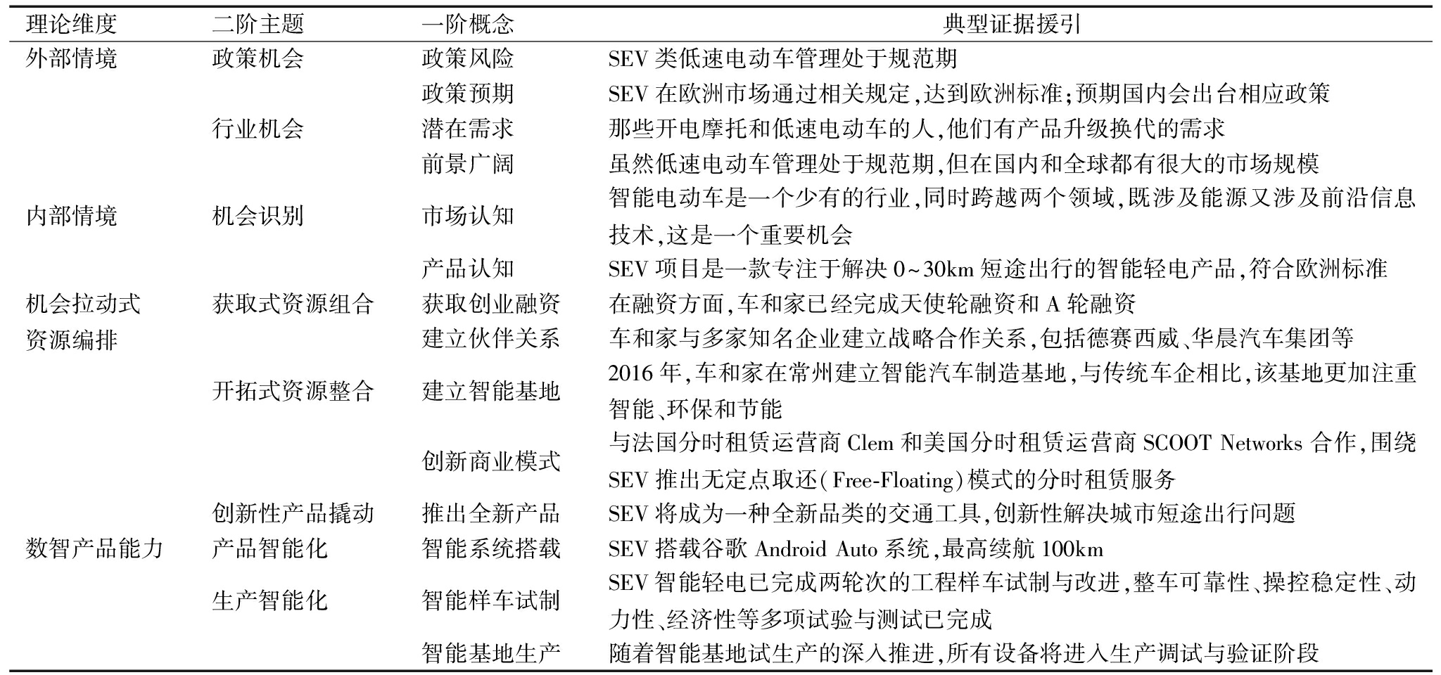 理论维度二阶主题一阶概念典型证据援引外部情境政策机会政策风险SEV类低速电动车管理处于规范期政策预期SEV在欧洲市场通过相关规定,达到欧洲标准;预期国内会出台相应政策行业机会潜在需求那些开电摩托和低速电动车的人,他们有产品升级换代的需求前景广阔虽然低速电动车管理处于规范期,但在国内和全球都有很大的市场规模内部情境机会识别市场认知智能电动车是一个少有的行业,同时跨越两个领域,既涉及能源又涉及前沿信息技术,这是一个重要机会产品认知SEV项目是一款专注于解决0~30km短途出行的智能轻电产品,符合欧洲标准机会拉动式资源编排获取式资源组合获取创业融资在融资方面,车和家已经完成天使轮融资和A轮融资建立伙伴关系车和家与多家知名企业建立战略合作关系,包括德赛西威、华晨汽车集团等开拓式资源整合建立智能基地2016年,车和家在常州建立智能汽车制造基地,与传统车企相比,该基地更加注重智能、环保和节能创新商业模式与法国分时租赁运营商Clem和美国分时租赁运营商SCOOT Networks合作,围绕SEV推出无定点取还(Free-Floating)模式的分时租赁服务创新性产品撬动推出全新产品SEV将成为一种全新品类的交通工具,创新性解决城市短途出行问题数智产品能力产品智能化智能系统搭载SEV搭载谷歌Android Auto系统,最高续航100km生产智能化智能样车试制SEV智能轻电已完成两轮次的工程样车试制与改进,整车可靠性、操控稳定性、动力性、经济性等多项试验与测试已完成智能基地生产随着智能基地试生产的深入推进,所有设备将进入生产调试与验证阶段