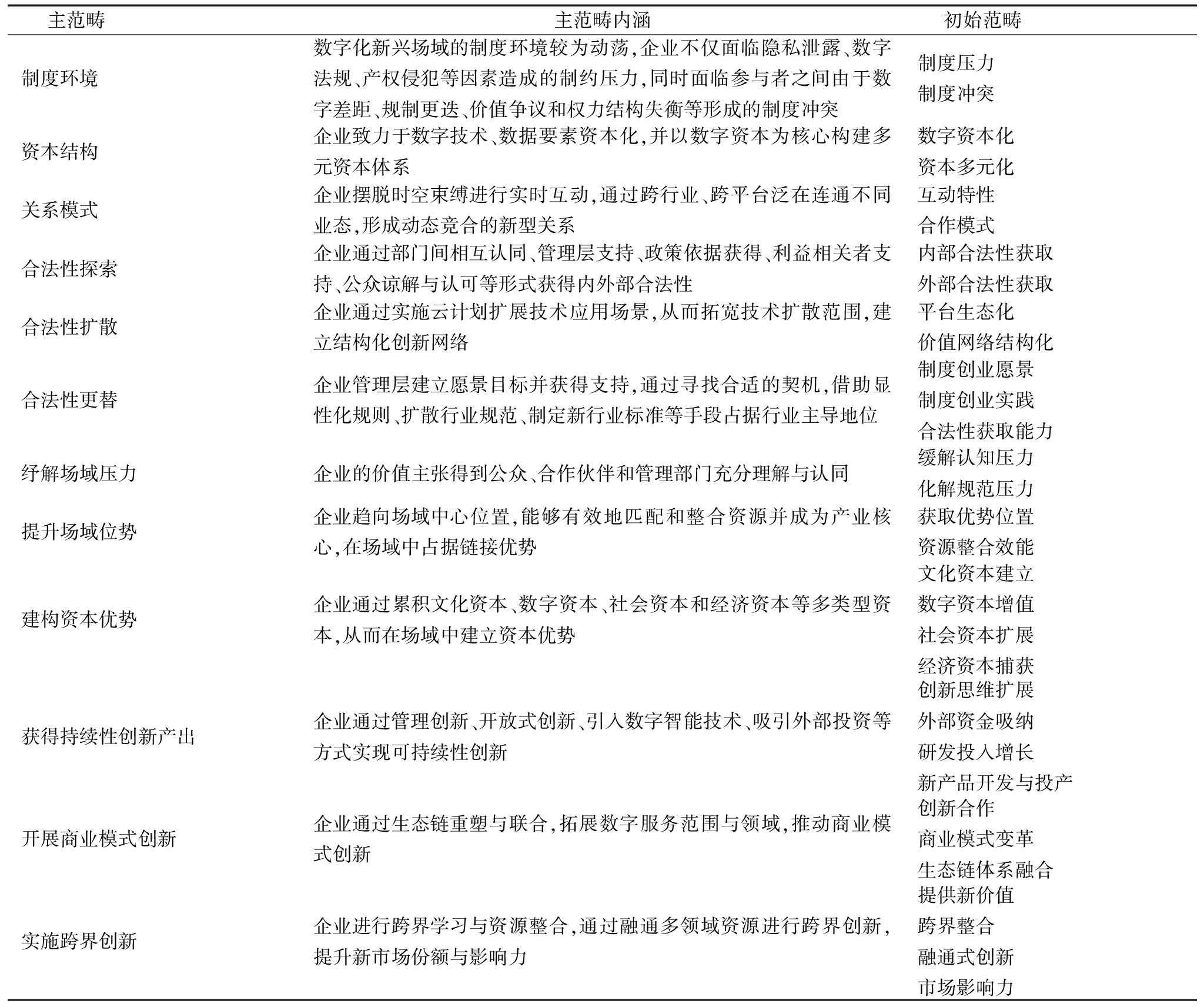主范畴主范畴内涵初始范畴制度环境数字化新兴场域的制度环境较为动荡,企业不仅面临隐私泄露、数字法规、产权侵犯等因素造成的制约压力,同时面临参与者之间由于数字差距、规制更迭、价值争议和权力结构失衡等形成的制度冲突制度压力制度冲突资本结构企业致力于数字技术、数据要素资本化,并以数字资本为核心构建多元资本体系数字资本化资本多元化关系模式企业摆脱时空束缚进行实时互动,通过跨行业、跨平台泛在连通不同业态,形成动态竞合的新型关系互动特性合作模式合法性探索企业通过部门间相互认同、管理层支持、政策依据获得、利益相关者支持、公众谅解与认可等形式获得内外部合法性内部合法性获取外部合法性获取合法性扩散企业通过实施云计划扩展技术应用场景,从而拓宽技术扩散范围,建立结构化创新网络平台生态化价值网络结构化合法性更替企业管理层建立愿景目标并获得支持,通过寻找合适的契机,借助显性化规则、扩散行业规范、制定新行业标准等手段占据行业主导地位制度创业愿景制度创业实践合法性获取能力纾解场域压力企业的价值主张得到公众、合作伙伴和管理部门充分理解与认同缓解认知压力化解规范压力提升场域位势企业趋向场域中心位置,能够有效地匹配和整合资源并成为产业核心,在场域中占据链接优势获取优势位置资源整合效能建构资本优势企业通过累积文化资本、数字资本、社会资本和经济资本等多类型资本,从而在场域中建立资本优势文化资本建立数字资本增值社会资本扩展经济资本捕获获得持续性创新产出企业通过管理创新、开放式创新、引入数字智能技术、吸引外部投资等方式实现可持续性创新 创新思维扩展外部资金吸纳研发投入增长新产品开发与投产开展商业模式创新企业通过生态链重塑与联合,拓展数字服务范围与领域,推动商业模式创新创新合作商业模式变革生态链体系融合实施跨界创新企业进行跨界学习与资源整合,通过融通多领域资源进行跨界创新,提升新市场份额与影响力提供新价值跨界整合融通式创新市场影响力