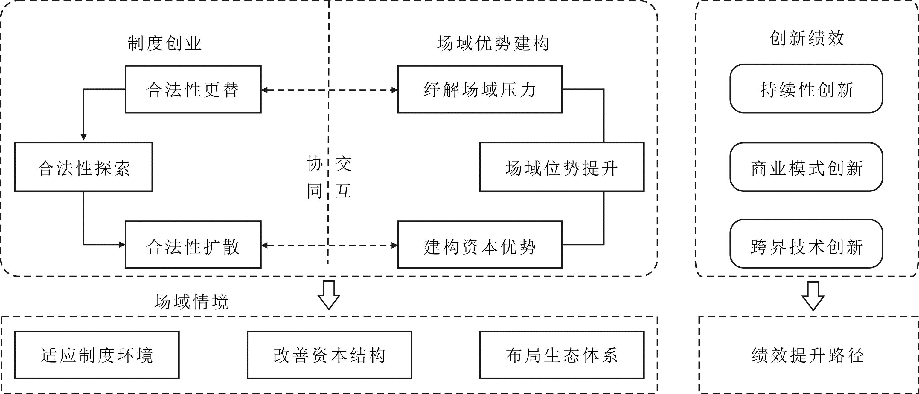 新制度主义理论认为制度创业是主体为了应对环境变化,对现行主流规制规范、价值观与行为惯例进行变革并建立内外部合法性的过程[18]。制度创业可以帮助创业者摆脱现有规制规范的桎梏,在新领域发现机会并形成竞争优势[19],本质上是创业者能动地适应环境变化的行为[20]。制度创业通常发生于新兴场域[21],是场域主体获得合法性的过程[22]。制度创业者通过形塑组织场域的制度逻辑,推动新兴场域形成与演化。