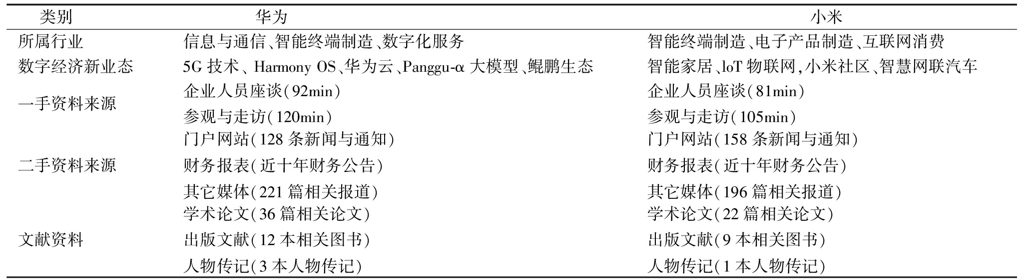 本文选择华为和小米作为分析对象,主要理由是:第一,两者符合针对研究主题的理论抽样。华为与小米公司是目前在数字经济领域发展较快的领军企业,具有在多个领域实施制度创业的经历。两家企业在数字化新兴场域制度创业的成功具有典型性,与本文研究主旨相符。第二,两家企业具有一定的差异性,适合进行理论比较验证。华为公司聚焦于数字化设备、5G网络、智能芯片等新业态,小米则在数字化概念营销、信念建树、认知推广等方面具有显著优势,二者的制度创业行为具有不同表象。通过两个案例的纵向比较,挖掘共性要素,可以为理论建构提供充足论据。
