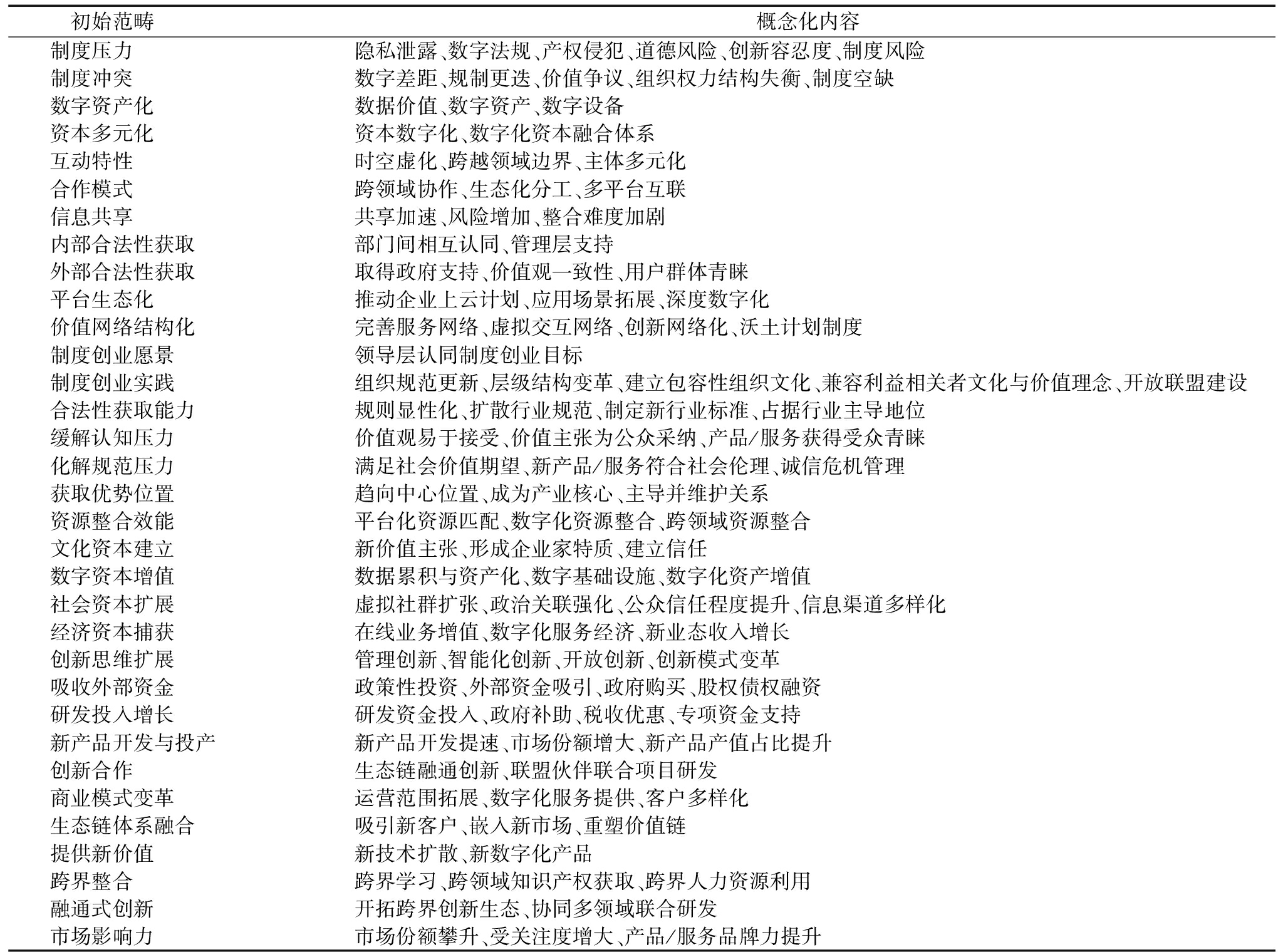 初始范畴概念化内容制度压力隐私泄露、数字法规、产权侵犯、道德风险、创新容忍度、制度风险制度冲突数字差距、规制更迭、价值争议、组织权力结构失衡、制度空缺数字资产化数据价值、数字资产、数字设备资本多元化资本数字化、数字化资本融合体系互动特性时空虚化、跨越领域边界、主体多元化合作模式跨领域协作、生态化分工、多平台互联信息共享共享加速、风险增加、整合难度加剧内部合法性获取部门间相互认同、管理层支持外部合法性获取取得政府支持、价值观一致性、用户群体青睐平台生态化推动企业上云计划、应用场景拓展、深度数字化价值网络结构化完善服务网络、虚拟交互网络、创新网络化、沃土计划制度制度创业愿景领导层认同制度创业目标制度创业实践组织规范更新、层级结构变革、建立包容性组织文化、兼容利益相关者文化与价值理念、开放联盟建设合法性获取能力规则显性化、扩散行业规范、制定新行业标准、占据行业主导地位缓解认知压力价值观易于接受、价值主张为公众采纳、产品/服务获得受众青睐化解规范压力满足社会价值期望、新产品/服务符合社会伦理、诚信危机管理获取优势位置趋向中心位置、成为产业核心、主导并维护关系资源整合效能平台化资源匹配、数字化资源整合、跨领域资源整合文化资本建立新价值主张、形成企业家特质、建立信任数字资本增值数据累积与资产化、数字基础设施、数字化资产增值社会资本扩展虚拟社群扩张、政治关联强化、公众信任程度提升、信息渠道多样化经济资本捕获在线业务增值、数字化服务经济、新业态收入增长创新思维扩展管理创新、智能化创新、开放创新、创新模式变革吸收外部资金政策性投资、外部资金吸引、政府购买、股权债权融资研发投入增长研发资金投入、政府补助、税收优惠、专项资金支持新产品开发与投产新产品开发提速、市场份额增大、新产品产值占比提升创新合作生态链融通创新、联盟伙伴联合项目研发商业模式变革运营范围拓展、数字化服务提供、客户多样化生态链体系融合吸引新客户、嵌入新市场、重塑价值链提供新价值新技术扩散、新数字化产品跨界整合跨界学习、跨领域知识产权获取、跨界人力资源利用融通式创新开拓跨界创新生态、协同多领域联合研发市场影响力市场份额攀升、受关注度增大、产品/服务品牌力提升
