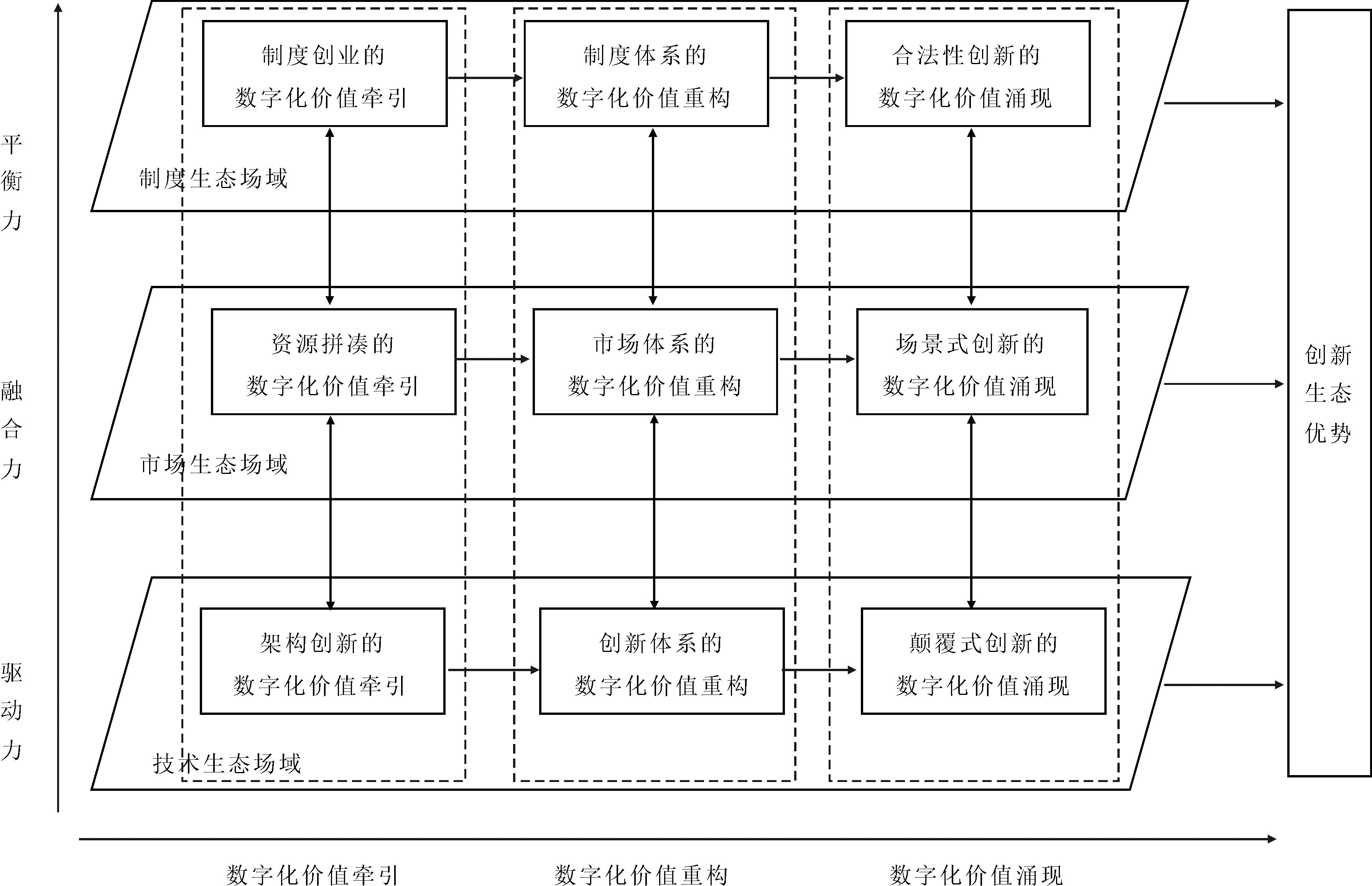 华为、京东等工业互联网平台领先企业牵引实现的数字化价值涌现是一个多元化、协同化的过程,其整合模型如图3所示。该过程主要包含三条影响路径:一是在技术生态场域,重点发挥架构创新的数字化价值牵引的触发作用,形成驱动力;二是在市场生态场域,重点发挥资源拼凑的数字化价值牵引的触发作用,形成融合力;三是在制度生态场域,重点发挥制度创业的数字化价值牵引的触发作用,形成平衡力。三条影响路径相互支持、协同共生,在不同维度上促进颠覆式创新、场景式创新和合法性创新的数字化价值涌现,塑造创新生态优势。