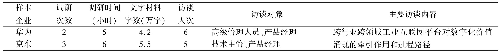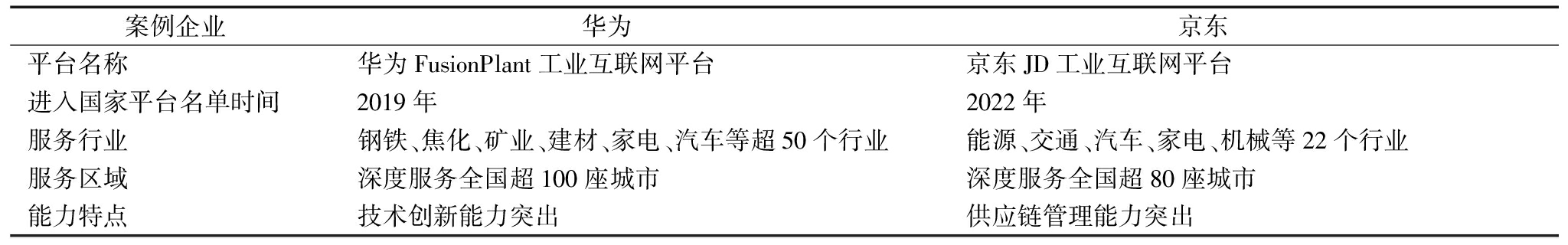 本文依据理论抽样原则,选择华为技术有限公司(简称华为)与北京京东世纪贸易有限公司(简称京东)作为案例研究对象,主要原因如下:①遵循案例典型性和代表性原则。华为连续5年进入工业和信息化部认定的跨行业跨领域工业互联网平台名单,其技术创新能力全球领先。京东于2022年进入工业和信息化部跨行业跨领域工业互联网平台名单,其供应链管理能力全球领先。②遵循适配性原则。两家案例企业均是国内领先的工业互联网平台企业,为相关行业提供集成化服务与解决方案。华为侧重于技术的深度融合和工业全场景的解决方案,服务全球超8 000家制造企业,其中全球制造100强企业达到78家。京东则侧重于打造数智化社会供应链,提供一体化供应链服务和数智化转型服务,为零售、物流、健康、智能城市等多元化领域提供服务。案例企业基本信息见表1。