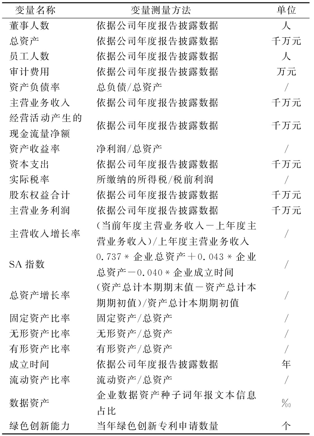 变量名称 变量测量方法 单位董事人数依据公司年度报告披露数据人总资产依据公司年度报告披露数据千万元员工人数依据公司年度报告披露数据人审计费用依据公司年度报告披露数据万元资产负债率总负债/总资产/主营业务收入依据公司年度报告披露数据千万元经营活动产生的现金流量净额依据公司年度报告披露数据千万元资产收益率净利润/总资产/资本支出依据公司年度报告披露数据千万元实际税率所缴纳的所得税/税前利润/股东权益合计依据公司年度报告披露数据千万元主营业务利润依据公司年度报告披露数据千万元主营收入增长率(当前年度主营业务收入-上年度主营业务收入)/上年度主营业务收入/SA指数0.737*企业总资产+0.043*企业总资产-0.040*企业成立时间/总资产增长率(资产总计本期期末值-资产总计本期期初值)/资产总计本期期初值/固定资产比率固定资产/总资产/无形资产比率无形资产/总资产/有形资产比率有形资产/总资产/成立时间依据公司年度报告披露数据年流动资产比率流动资产/总资产/数据资产企业数据资产种子词年报文本信息占比‰绿色创新能力当年绿色创新专利申请数量个