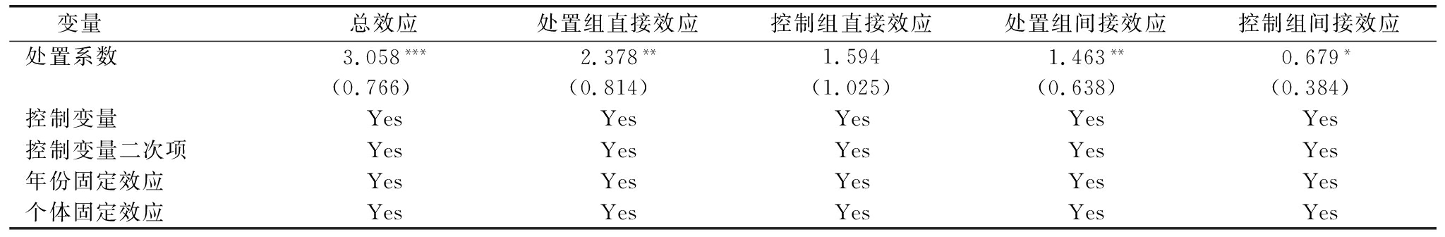 变量总效应处置组直接效应控制组直接效应处置组间接效应控制组间接效应处置系数3.058***2.378**1.5941.463**0.679*(0.766)(0.814)(1.025)(0.638)(0.384)控制变量YesYesYesYesYes控制变量二次项YesYesYesYesYes年份固定效应YesYesYesYesYes个体固定效应YesYesYesYesYes