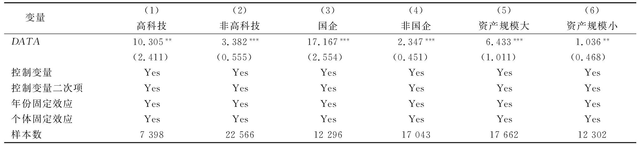变量(1)(2)(3)(4)(5)(6)高科技非高科技国企非国企资产规模大资产规模小DATA10.305**3.382***17.167***2.347***6.433***1.036**(2.411)(0.555)(2.554)(0.451)(1.011)(0.468)控制变量YesYesYesYesYesYes控制变量二次项YesYesYesYesYesYes年份固定效应YesYesYesYesYesYes个体固定效应YesYesYesYesYesYes样本数73982256612296170431766212302