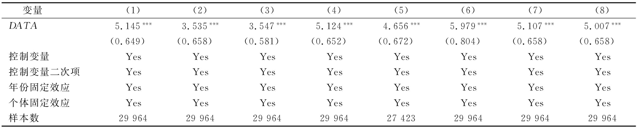 变量(1)(2)(3)(4)(5)(6)(7)(8)DATA5.145***3.535***3.547***5.124***4.656***5.979***5.107***5.007***(0.649)(0.658)(0.581)(0.652)(0.672)(0.804)(0.658)(0.658)控制变量YesYesYesYesYesYesYesYes控制变量二次项YesYesYesYesYesYesYesYes年份固定效应YesYesYesYesYesYesYesYes个体固定效应YesYesYesYesYesYesYesYes样本数2996429964299642996427423299642996429964