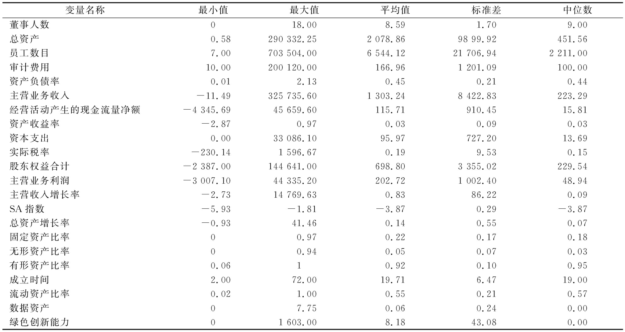本研究选取了一系列控制变量,涵盖企业治理、财务状况、经营绩效等多个维度,包括:董事人数、总资产、员工数目、审计费用、资产负债率、主营业务收入、经营活动产生的现金流量净额、资产收益率、资本支出、实际税率、股东权益合计、主营业务利润、主营收入增长率、SA指数、总资产增长率、固定资产比率、无形资产比率、有形资产比率、成立时间、流动资产比率。控制变量选择旨在控制企业规模、财务表现、盈利能力以及资产结构等可能影响绿色创新能力的潜在因素。