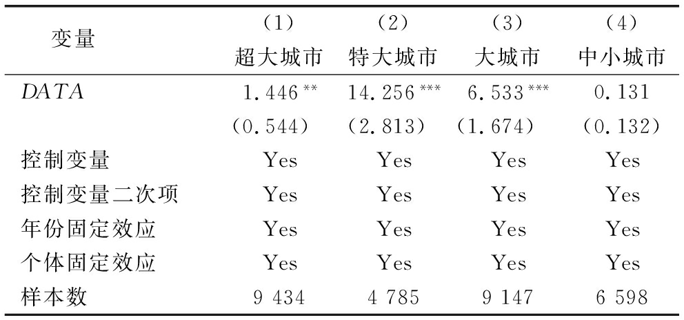 变量(1)(2)(3)(4)超大城市特大城市大城市中小城市DATA1.446**14.256***6.533***0.131(0.544)(2.813)(1.674)(0.132)控制变量YesYesYesYes控制变量二次项YesYesYesYes年份固定效应YesYesYesYes个体固定效应YesYesYesYes样本数9434478591476598