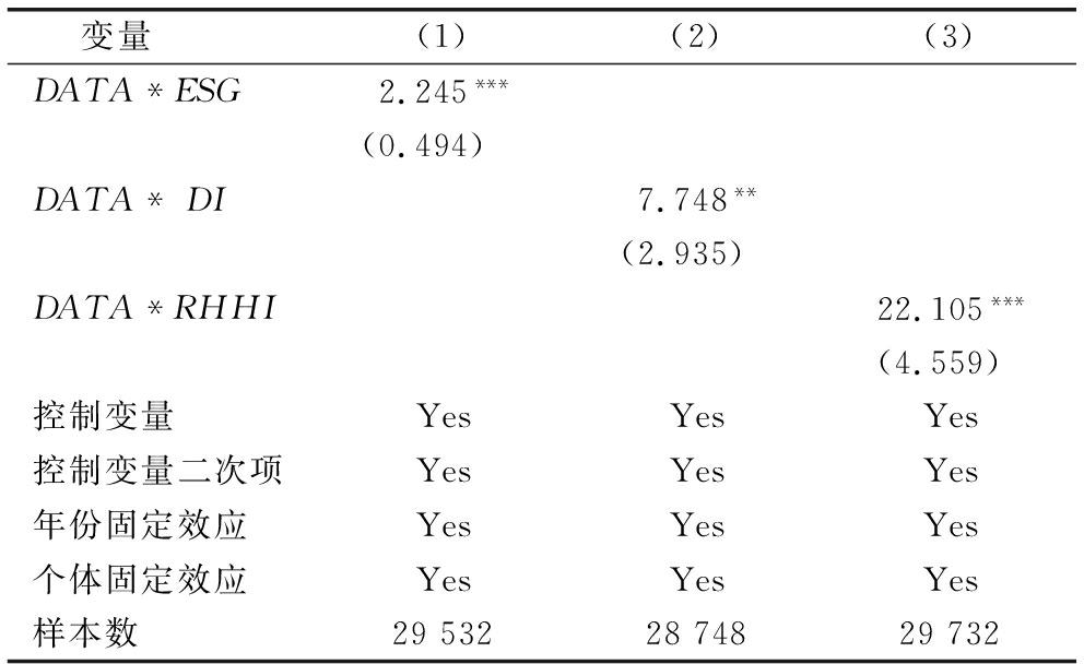 变量(1)(2)(3)DATA*ESG2.245***(0.494)DATA*DI7.748**(2.935)DATA*RHHI22.105***(4.559)控制变量YesYesYes控制变量二次项YesYesYes年份固定效应YesYesYes个体固定效应YesYesYes样本数295322874829732