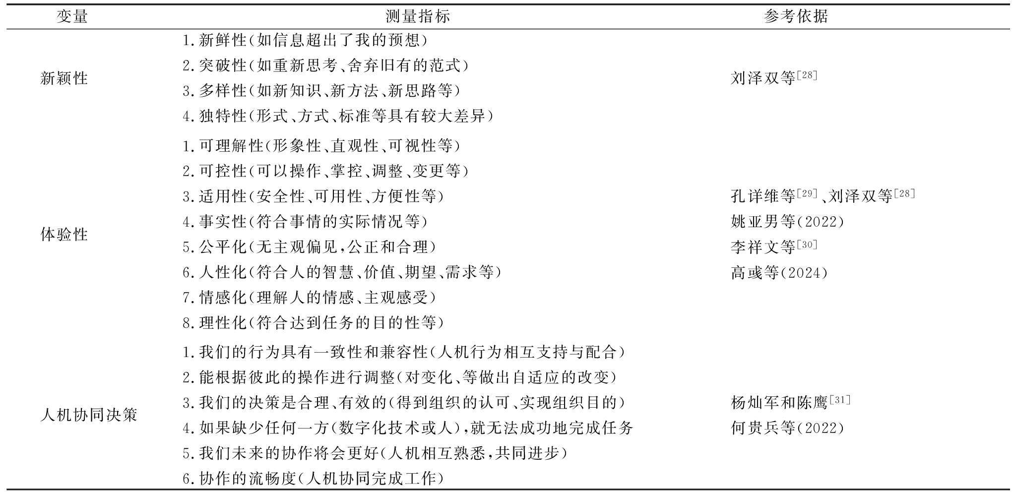变量测量指标参考依据新颖性1.新鲜性(如信息超出了我的预想)2.突破性(如重新思考、舍弃旧有的范式)3.多样性(如新知识、新方法、新思路等)4.独特性(形式、方式、标准等具有较大差异)刘泽双等[28]体验性1.可理解性(形象性、直观性、可视性等)2.可控性(可以操作、掌控、调整、变更等)3.适用性(安全性、可用性、方便性等)4.事实性(符合事情的实际情况等)5.公平化(无主观偏见,公正和合理)6.人性化(符合人的智慧、价值、期望、需求等)7.情感化(理解人的情感、主观感受)8.理性化(符合达到任务的目的性等)孔详维等[29]、刘泽双等[28]姚亚男等(2022)李祥文等[30]高彧等(2024)人机协同决策1.我们的行为具有一致性和兼容性(人机行为相互支持与配合)2.能根据彼此的操作进行调整(对变化、等做出自适应的改变)3.我们的决策是合理、有效的(得到组织的认可、实现组织目的)4.如果缺少任何一方(数字化技术或人),就无法成功地完成任务5.我们未来的协作将会更好(人机相互熟悉,共同进步)6.协作的流畅度(人机协同完成工作)杨灿军和陈鹰[31]何贵兵等(2022)
