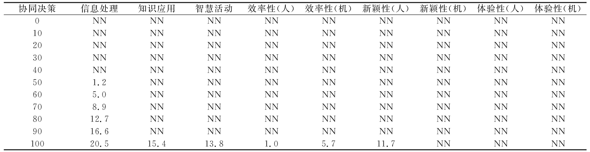 注:“XX”表示信息处理;“ZS”表示知识应用;“SW”表示智慧活动;“Xr”表示人的效率性;“Xj”表示机的效率性;“Yr”表示人的新颖性;“Yj”表示机的新颖性;“Tr”表示人的体验性;“Tj”表示机的体验性;“JC”表示协同决策