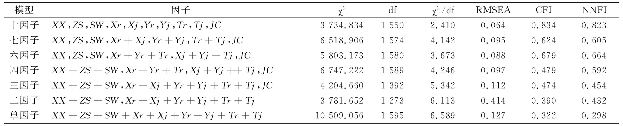 模型因子χ2dfχ2/dfRMSEACFINNFI十因子XX,ZS,SW,Xr,Xj,Yr,Yj,Tr,Tj,JC3734.83415502.4100.0640.8340.823七因子XX,ZS,SW,Xr+Xj,Yr+Yj,Tr+Tj,JC6518.90615744.1420.0950.6240.605六因子XX,ZS,SW,Xr+Yr+Tr,Xj+Yj+Tj,JC5803.17315803.6730.0880.6790.664四因子XX+ZS+SW,Xr+Yr+Tr,Xj+Yj++Tj,JC6747.22215894.2460.0970.4790.592三因子XX+ZS+SW,Xr+Xj+Yr+Yj+Tr+Tj,JC4204.66013925.3420.1120.4740.454二因子XX+ZS+SW,Xr+Xj+Yr+Yj+Tr+Tj3781.65212736.1130.4140.3900.432单因子XX+ZS+SW+Xr+Xj+Yr+Yj+Tr+Tj10509.05615956.5890.1270.3220.298