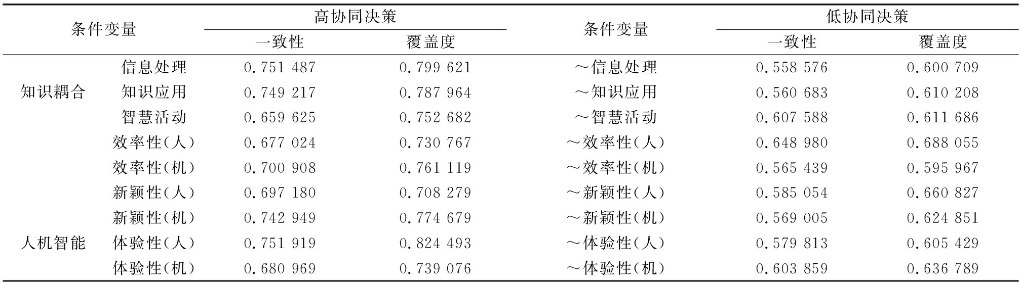 在该组态下,信息处理、知识应用、智慧活动以及机的效率性和体验性为核心条件缺失,且人的效率性和体验性为边缘条件缺失,产生低人机协同决策行为。这表明若没有人机知识耦合的基础,则机的基础性功能——机的效率性缺少作为核心条件的作用机会,人机协同的先决条件——机的体验性更缺少作为核心条件的作用根基,从而导致人的效率性与体验性也无从谈起(二者为边缘条件缺失)(Chen等,2021)。低协同决策组态逻辑恰好从反向印证了前文论述。