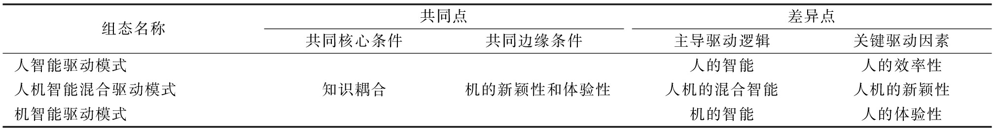 组态名称共同点共同核心条件共同边缘条件差异点主导驱动逻辑关键驱动因素人智能驱动模式人的智能人的效率性人机智能混合驱动模式知识耦合机的新颖性和体验性人机的混合智能人机的新颖性机智能驱动模式机的智能人的体验性