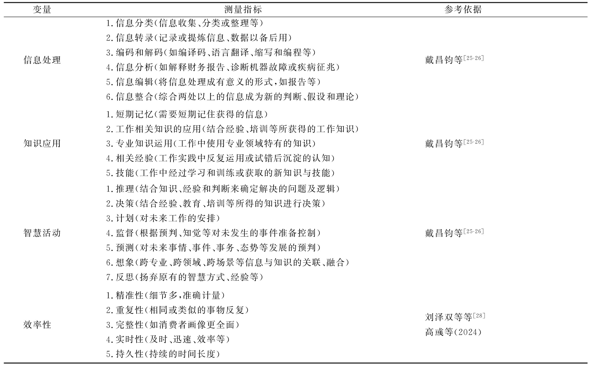 变量测量指标参考依据信息处理1.信息分类(信息收集、分类或整理等)2.信息转录(记录或提炼信息、数据以备后用)3.编码和解码(如编译码、语言翻译、缩写和编程等)4.信息分析(如解释财务报告、诊断机器故障或疾病征兆)5.信息编辑(将信息处理成有意义的形式,如报告等)6.信息整合(综合两处以上的信息成为新的判断、假设和理论)戴昌钧等[25-26]知识应用1.短期记忆(需要短期记住获得的信息)2.工作相关知识的应用(结合经验、培训等所获得的工作知识)3.专业知识运用(工作中使用专业领域特有的知识)4.相关经验(工作实践中反复运用或试错后沉淀的认知)5.技能(工作中经过学习和训练或获取的新知识与技能)戴昌钧等[25-26]智慧活动1.推理(结合知识、经验和判断来确定解决的问题及逻辑)2.决策(结合经验、教育、培训等所得的知识进行决策)3.计划(对未来工作的安排)4.监督(根据预判、知觉等对未发生的事件准备控制)5.预测(对未来事情、事件、事务、态势等发展的预判)6.想象(跨专业、跨领域、跨场景等信息与知识的关联、融合)7.反思(扬弃原有的智慧方式、经验等)戴昌钧等[25-26]效率性1.精准性(细节多,准确计量)2.重复性(相同或类似的事物反复)3.完整性(如消费者画像更全面)4.实时性(及时、迅速、效率等)5.持久性(持续的时间长度)刘泽双等等[28]高彧等(2024)