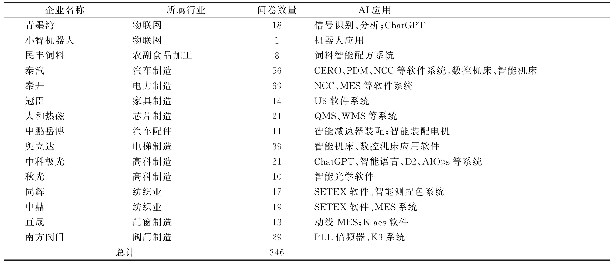 表1 调研企业与AI应用案例情况