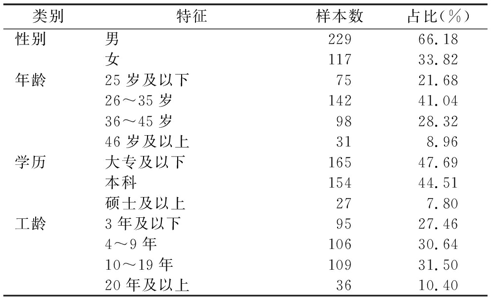 类别特征样本数占比(%)性别男22966.18女11733.82年龄25岁及以下7521.6826~35岁14241.0436~45岁9828.3246岁及以上318.96学历大专及以下16547.69本科15444.51硕士及以上277.80工龄3年及以下9527.464~9年10630.6410~19年10931.5020年及以上3610.40