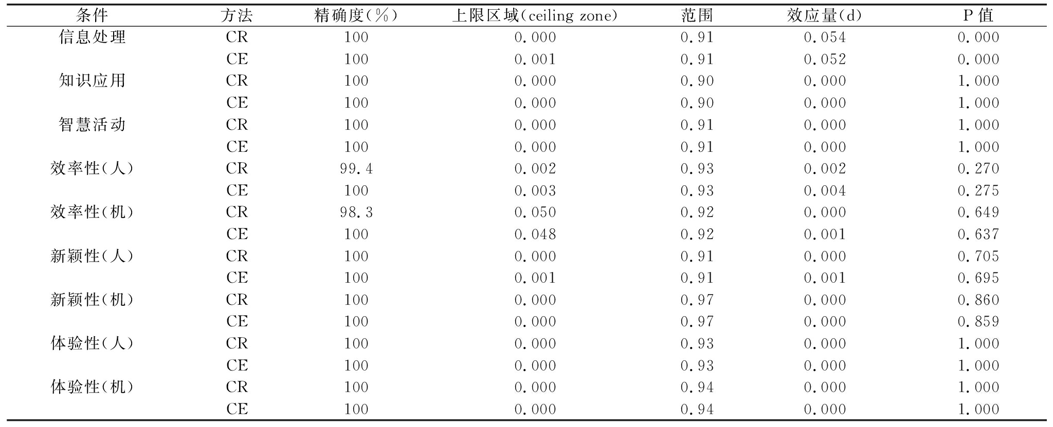 条件方法精确度(%)上限区域(ceilingzone)范围效应量(d)P值信息处理CR1000.0000.910.0540.000CE1000.0010.910.0520.000知识应用CR1000.0000.900.0001.000CE1000.0000.900.0001.000智慧活动CR1000.0000.910.0001.000CE1000.0000.910.0001.000效率性(人)CR99.40.0020.930.0020.270CE1000.0030.930.0040.275效率性(机)CR98.30.0500.920.0000.649CE1000.0480.920.0010.637新颖性(人)CR1000.0000.910.0000.705CE1000.0010.910.0010.695新颖性(机)CR1000.0000.970.0000.860CE1000.0000.970.0000.859体验性(人)CR1000.0000.930.0001.000CE1000.0000.930.0001.000体验性(机)CR1000.0000.940.0001.000CE1000.0000.940.0001.000
