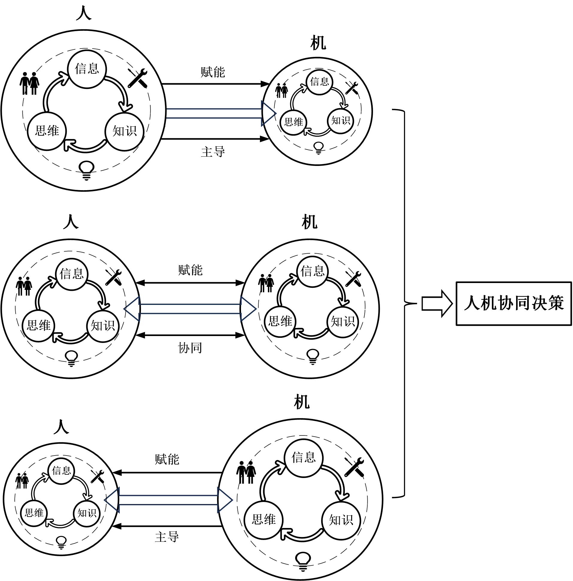 从本质而言,人机都可视为智能体(图1中虚线标注),由知识体(信息—知识—智慧)构成其底层内核,由不断迭代的循环(信息处理—知识应用—智慧活动)所驱动。信息处理、知识应用、智慧活动3种不同质态知识在人机间相互联结与渗透融合(知识耦合),见图1双箭头所示。按照情景认知(SA)和DIKW层级模型[33]理论,知识跨级进阶为智能的过程是人机智能体内的知识体相互影响和协同演化的过程。因此,知识耦合既是智能体/知识体的交互过程,也是人机智能交互的底层逻辑,而智能差异只不过是知识体在人机不同系统内迭代升级的结果表现。智能体在人系统和机系统中所表现出的效率性、新颖性和体验性差异很大,需要人机智能协同。在知识耦合联动下不同的人机智能组合与优势互补产生3种人机协同决策模式。