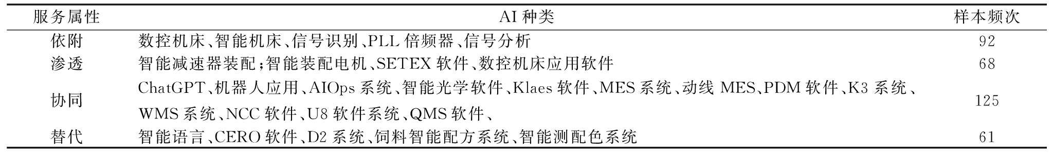 服务属性AI种类样本频次依附数控机床、智能机床、信号识别、PLL倍频器、信号分析92渗透智能减速器装配;智能装配电机、SETEX软件、数控机床应用软件68协同ChatGPT、机器人应用、AIOps系统、智能光学软件、Klaes软件、MES系统、动线MES、PDM软件、K3系统、WMS系统、NCC软件、U8软件系统、QMS软件、125替代智能语言、CERO软件、D2系统、饲料智能配方系统、智能测配色系统61