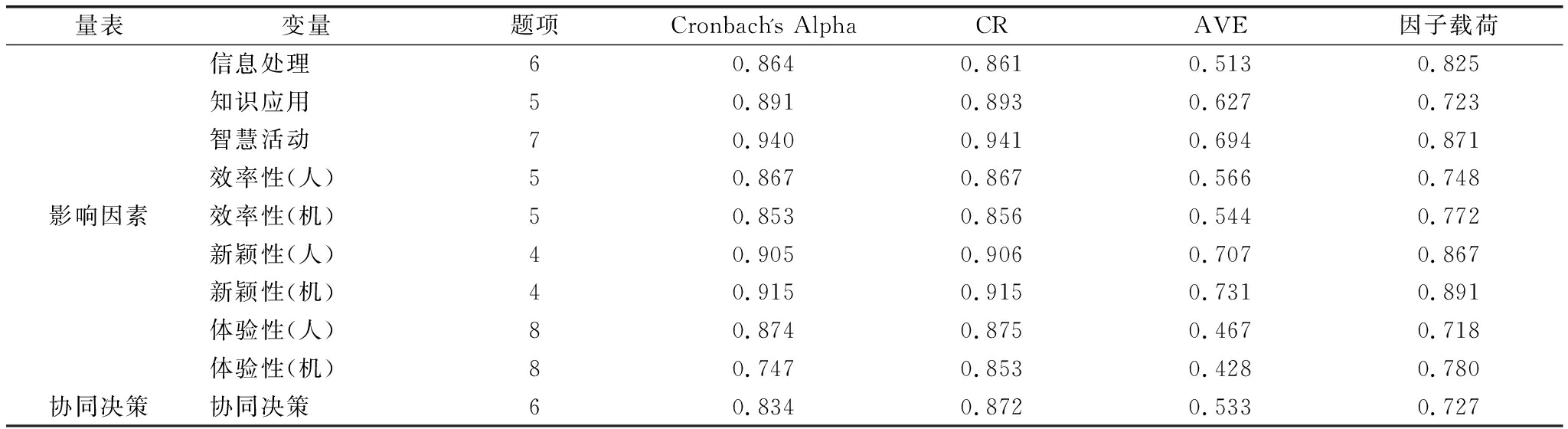 量表变量题项Cronbach'sAlphaCRAVE因子载荷信息处理60.8640.8610.5130.825知识应用50.8910.8930.6270.723智慧活动70.9400.9410.6940.871效率性(人)50.8670.8670.5660.748影响因素效率性(机)50.8530.8560.5440.772新颖性(人)40.9050.9060.7070.867新颖性(机)40.9150.9150.7310.891体验性(人)80.8740.8750.4670.718体验性(机)80.7470.8530.4280.780协同决策协同决策60.8340.8720.5330.727