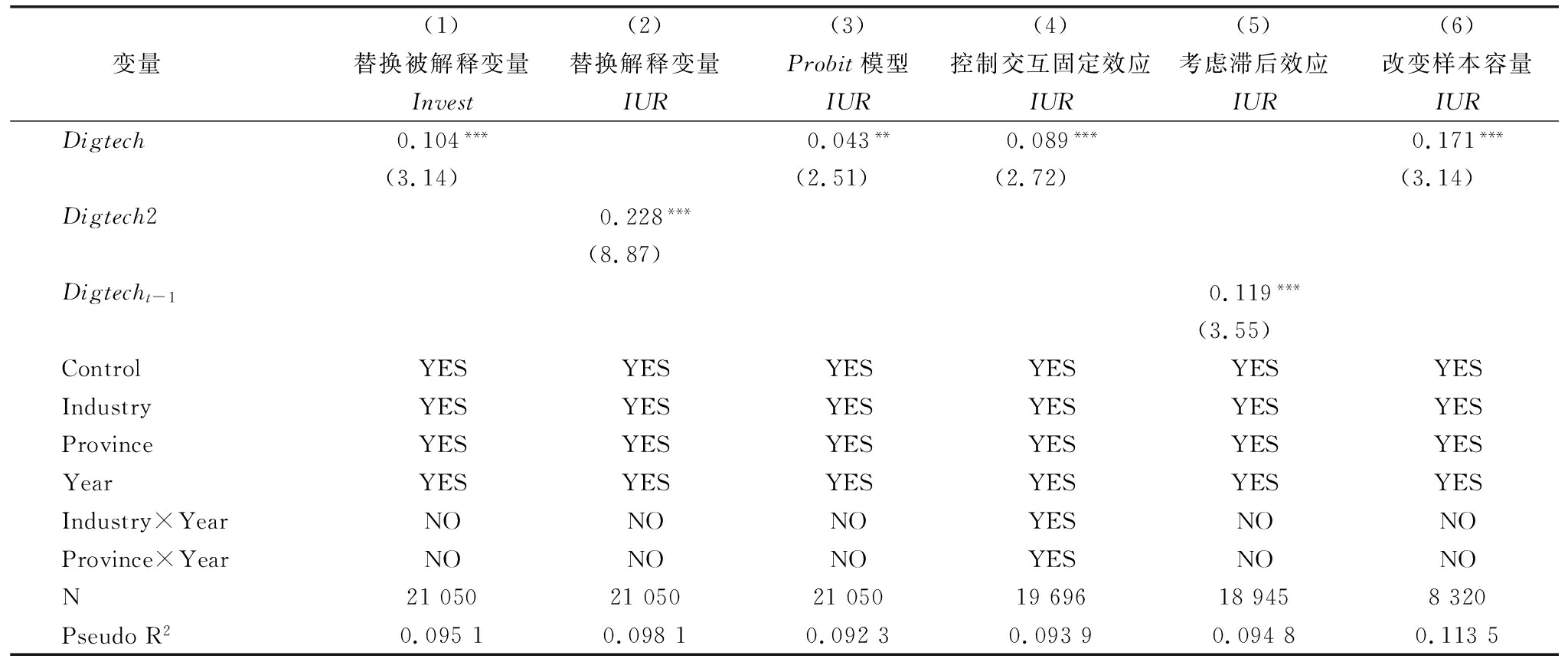 (1)(2)(3)(4)(5)(6)变量 替换被解释变量替换解释变量Probit模型控制交互固定效应考虑滞后效应改变样本容量InvestIURIURIURIURIURDigtech0.104***0.043**0.089***0.171***(3.14)(2.51)(2.72)(3.14)Digtech20.228***(8.87)Digtecht-10.119***(3.55)ControlYESYESYESYESYESYESIndustryYESYESYESYESYESYESProvinceYESYESYESYESYESYESYearYESYESYESYESYESYESIndustry×YearNONONOYESNONOProvince×YearNONONOYESNONON21050210502105019696189458320PseudoR20.09510.09810.09230.09390.09480.1135