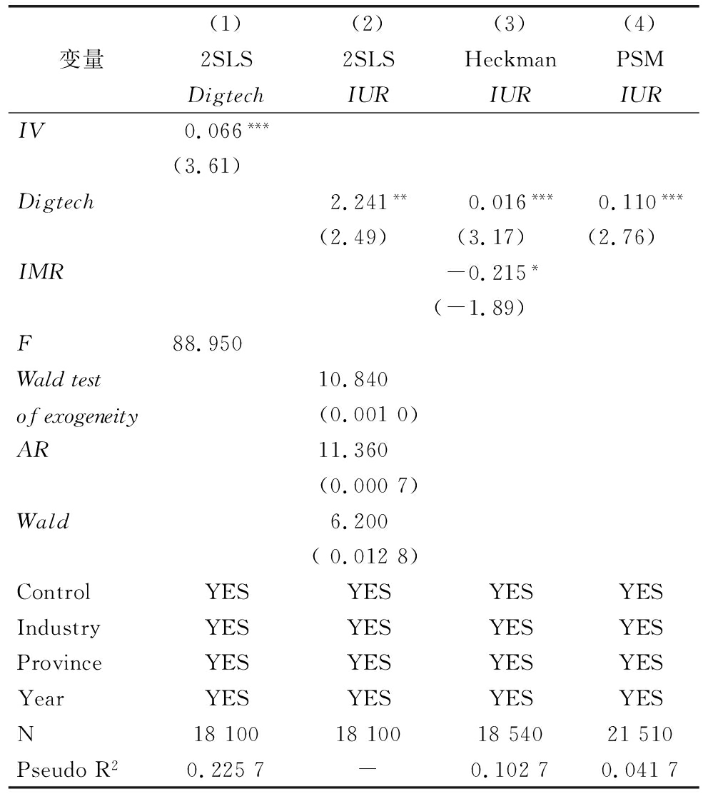(1)(2)(3)(4)变量2SLS2SLSHeckmanPSMDigtechIURIURIURIV0.066***(3.61)Digtech2.241**0.016***0.110***(2.49)(3.17)(2.76)IMR-0.215*(-1.89)F88.950Waldtestofexogeneity10.840(0.0010)AR11.360(0.0007)Wald6.200(0.0128)ControlYESYESYESYESIndustryYESYESYESYESProvinceYESYESYESYESYearYESYESYESYESN18100181001854021510PseudoR20.2257-0.10270.0417