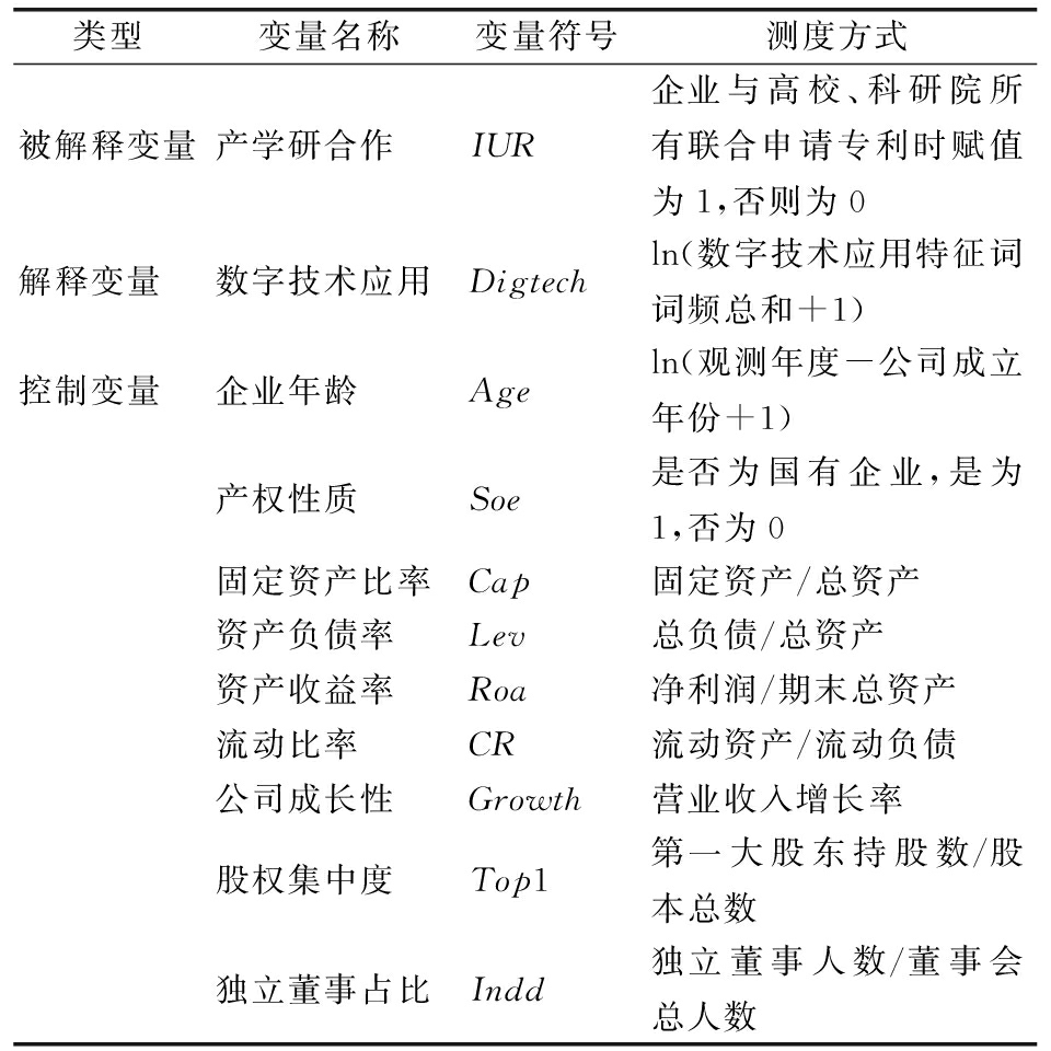 类型变量名称变量符号测度方式被解释变量产学研合作IUR企业与高校、科研院所有联合申请专利时赋值为1,否则为0解释变量 数字技术应用Digtechln(数字技术应用特征词词频总和+1)控制变量 企业年龄Ageln(观测年度-公司成立年份+1)产权性质Soe是否为国有企业,是为1,否为0固定资产比率Cap固定资产/总资产资产负债率Lev总负债/总资产资产收益率Roa净利润/期末总资产流动比率CR流动资产/流动负债公司成长性Growth营业收入增长率股权集中度Top1第一大股东持股数/股本总数独立董事占比Indd独立董事人数/董事会总人数