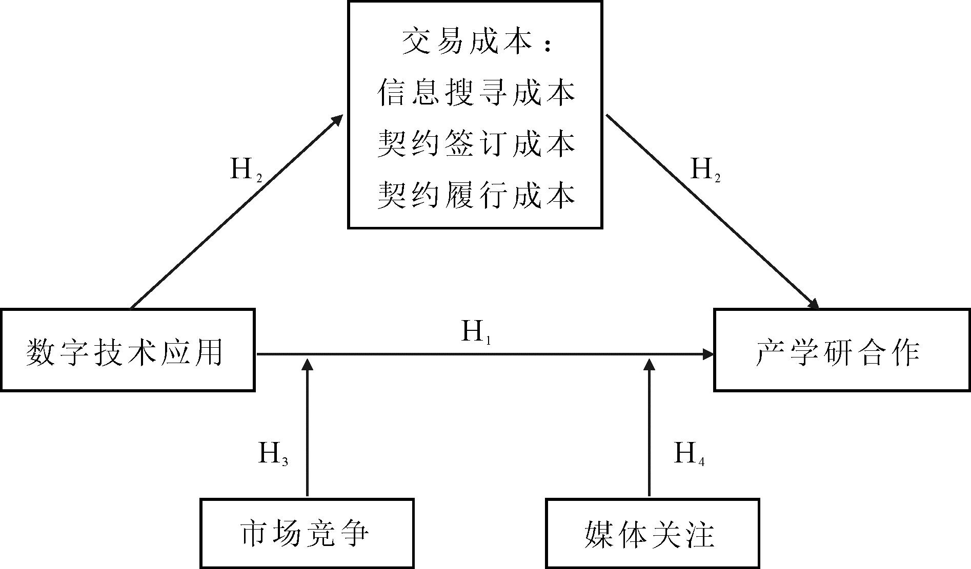 数字技术应用能够使企业在更加透明的信息环境中实现产学研合作,降低企业交易成本。根据交易成本理论,在产学研合作过程中往往涉及一系列交易成本,主要包括信息搜寻、契约签订及履行等成本[14-15]。从信息搜寻成本看,企业在寻找匹配自身需求的创新资源和合作伙伴时常面临较大压力,传统方式不仅耗费大量人力、物力和时间,还存在难以找到合适伙伴的风险。随着数字技术的应用,通过高效搜索引擎、大数据分析和信息共享平台等手段,企业能够迅速、精准地掌握潜在合作伙伴信息及其拥有的创新资源,大幅提升信息搜寻效率与成功匹配概率,从而有效降低信息搜寻成本[16]。就契约签订成本而言,企业选定合作伙伴后随即进入协商与谈判阶段,直至契约签订,这一过程伴随着不可忽视的时间、人力与资源投入。依托数字技术,企业能够快速拟定、修改和审核契约条款,实现远程协作与即时沟通。这不仅能大幅缩短协商周期,还能提高契约签订效率和准确性,从而有效降低契约签订成本[17]。从契约履行成本看,开放式创新的复杂性和潜在机会主义行为可能会加剧企业道德风险。通过运用数字技术(如区块链分布式账本可确保交易透明可追溯、智能合约自动执行,从而降低违约风险;大数据分析可预测潜在问题并提前采取预防措施),企业能够有效降低契约履行成本,增强产学研合作稳定性[18]。据此,本文提出如下假设: