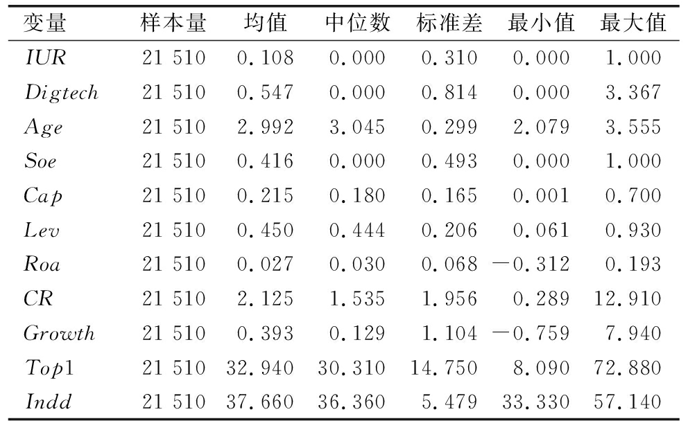 其中,i、t分别表示公司和时间,IUR为被解释变量,Digtech为解释变量,Control为一系列控制变量,α0表示常数项,α1~αj表示自变量和控制变量系数,Industry、Province、Year分别表示企业所属行业、省份及年份效应,ε为误差项。