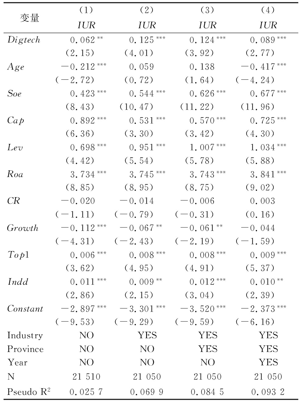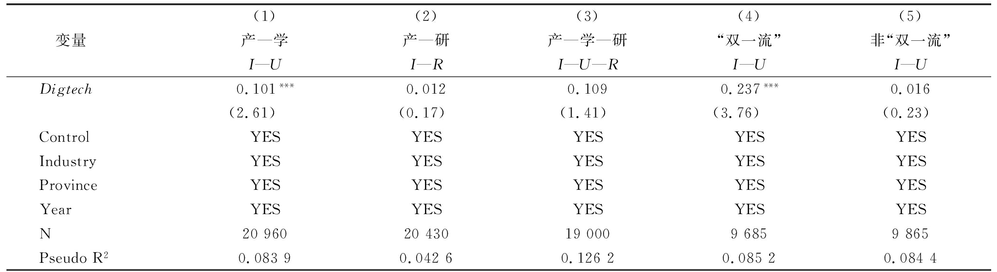 本文利用模型(1)检验数字技术应用对产学研合作的影响效应。需要说明的是,由于产学研合作(IUR)为二元变量,因此采用离散变量概率模型Logit进行回归分析。